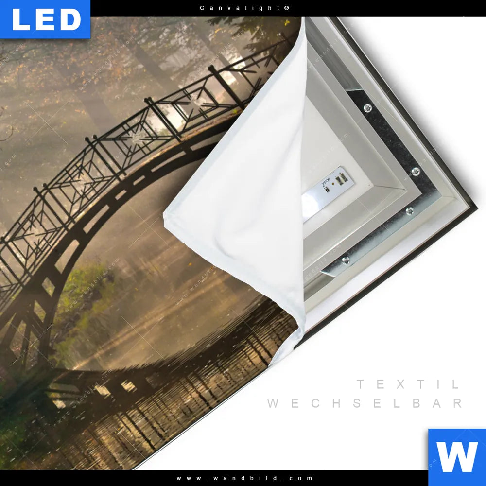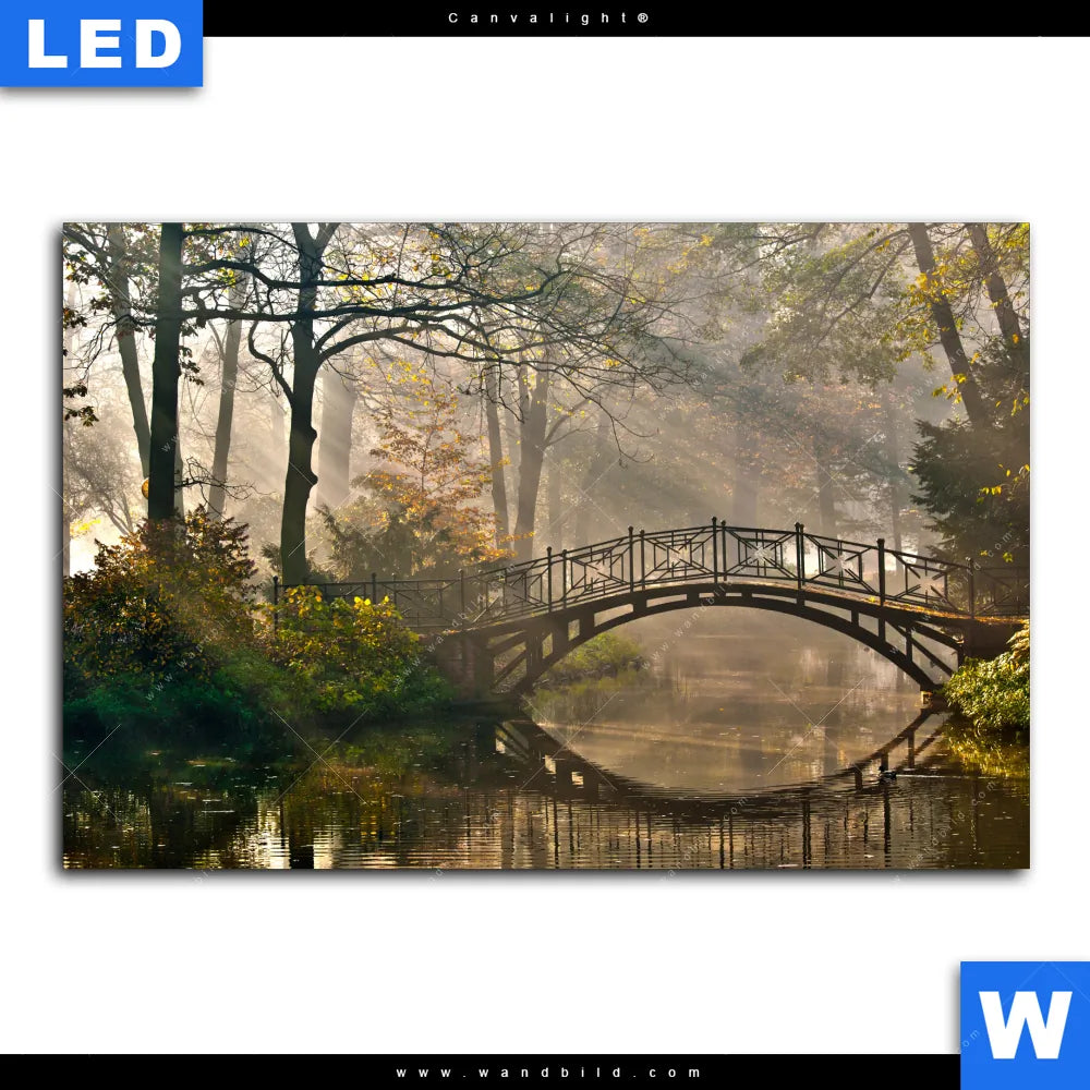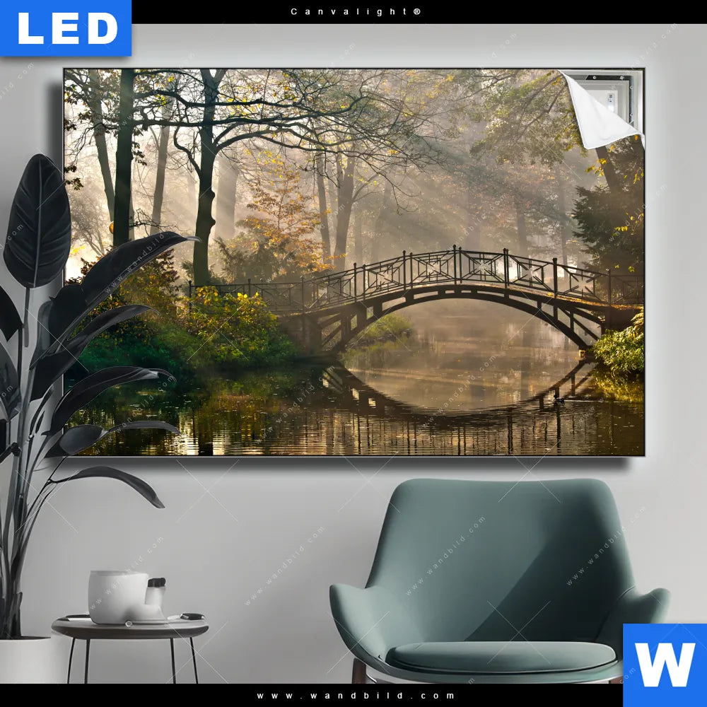 Canvalight® TEX Leuchtbild | Idyllischer Wald mit Brücke | Querformat