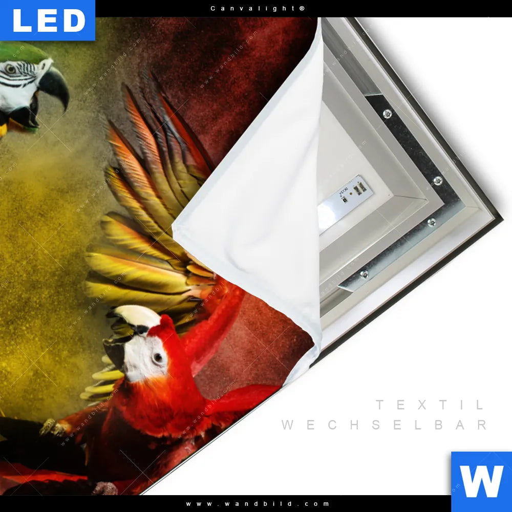 Canvalight® TEX Leuchtbild | Kampf der Papageien | Hochformat