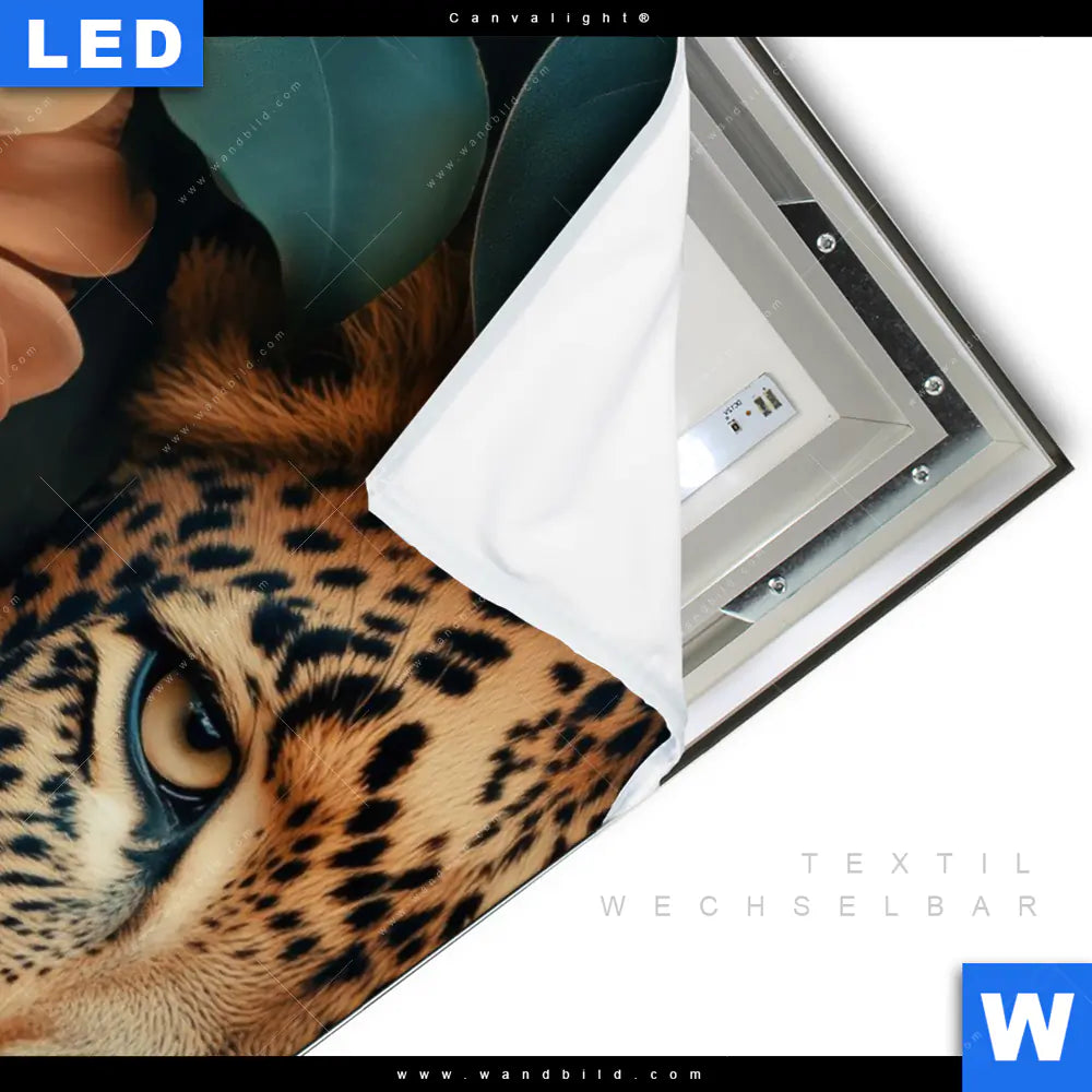 Canvalight® TEX Leuchtbild | Leopard im Blütenmeer | Hochformat