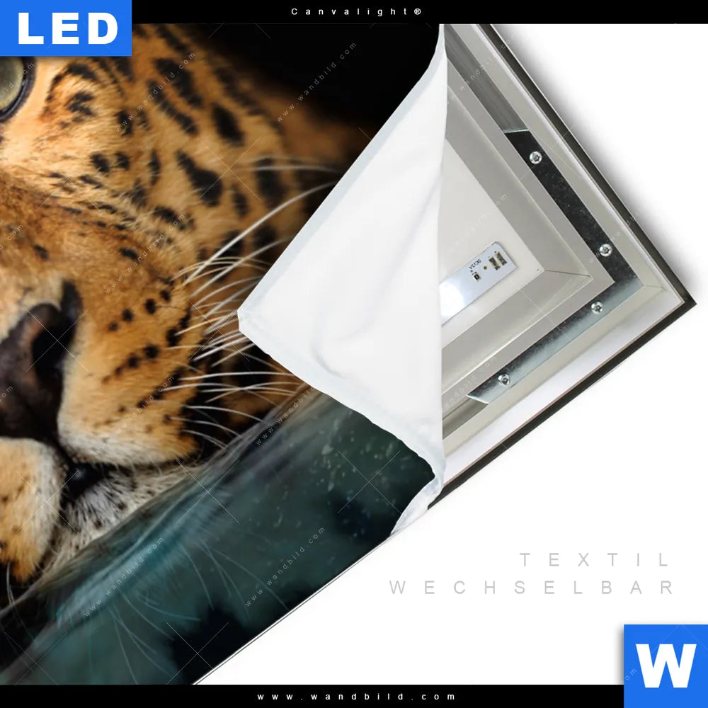 Canvalight® TEX Leuchtbild | Leopard im Wasser | Querformat