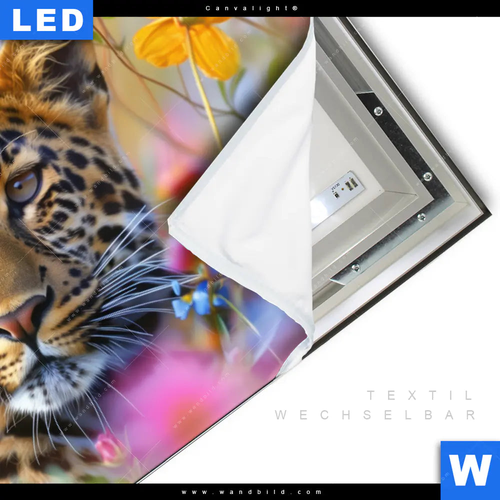 Canvalight® TEX Leuchtbild | Leopard in blühender Wildnis | Querformat