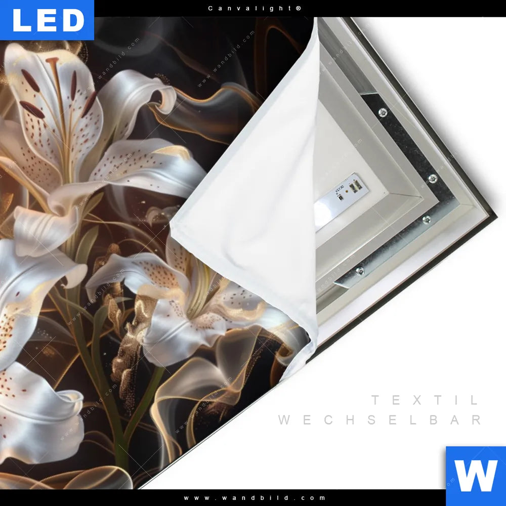 Canvalight® TEX Leuchtbild | Lilien in goldenem Rauch | Hochformat