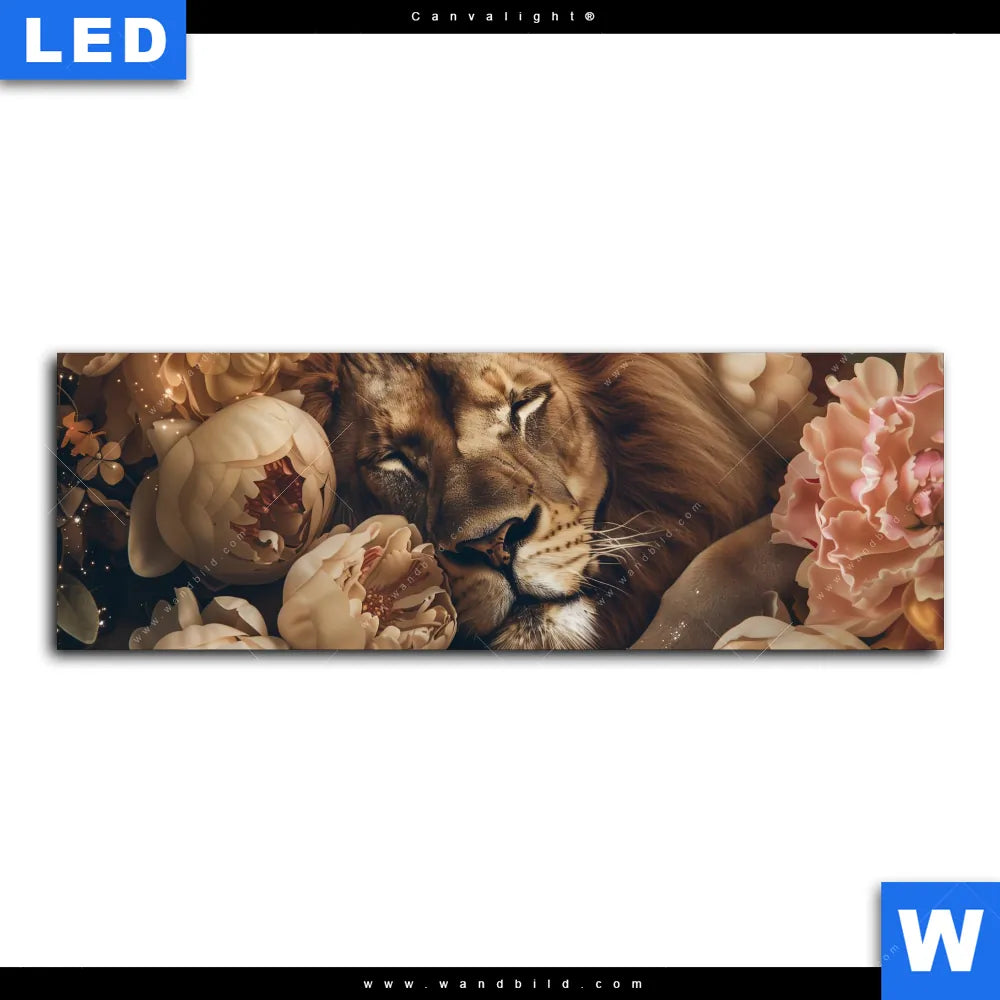 Canvalight® Leuchtbild | Löwe schläft in Blüten | Panorama