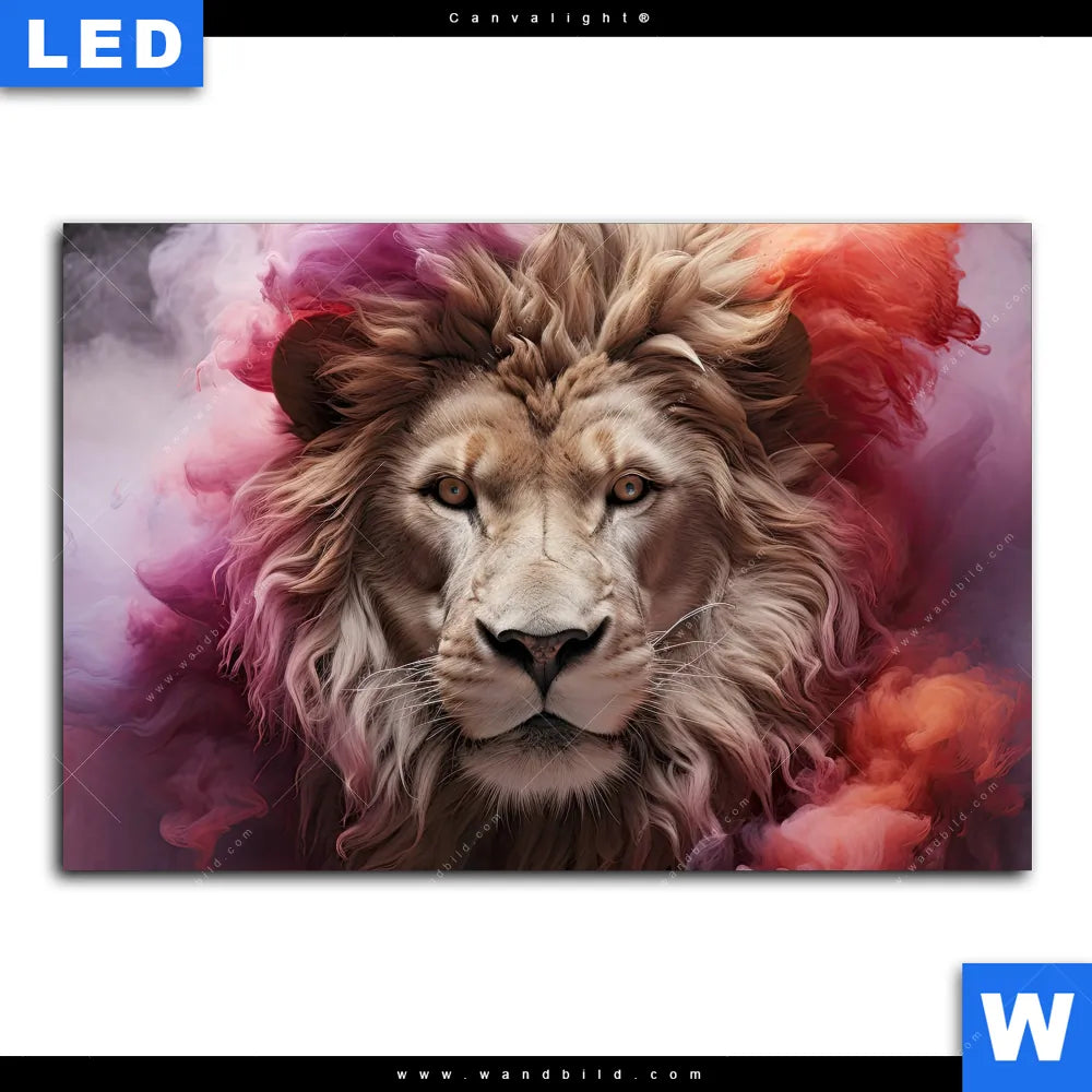 Canvalight® Leuchtbild | Löwengesicht in buntem Rauch | Querformat