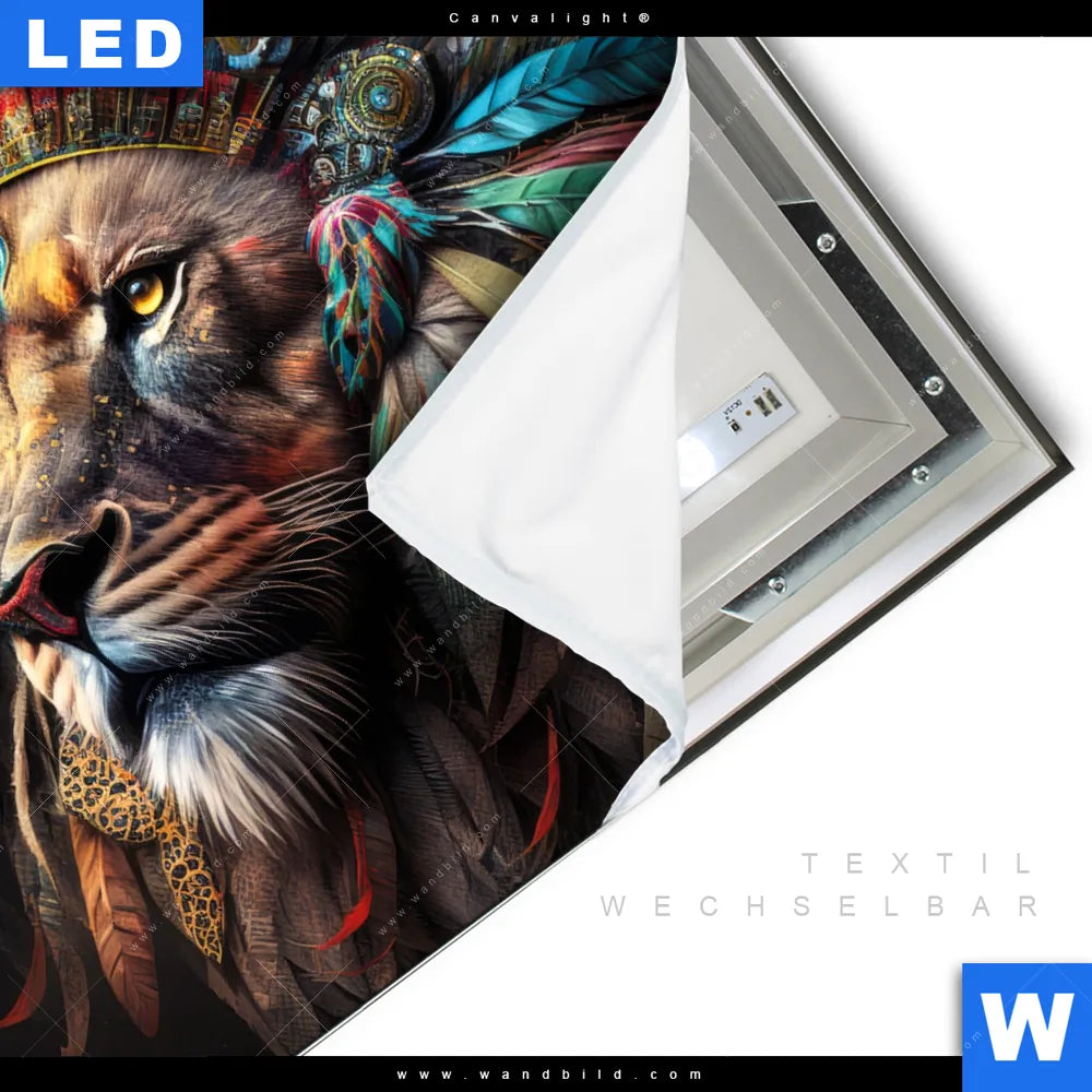 Canvalight® TEX Leuchtbild | Löwenkopf mit bunten Federn | Quadrat