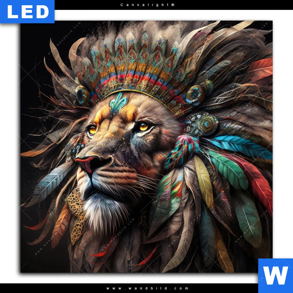 Canvalight® Leuchtbild | Löwenkopf mit bunten Federn | Quadrat