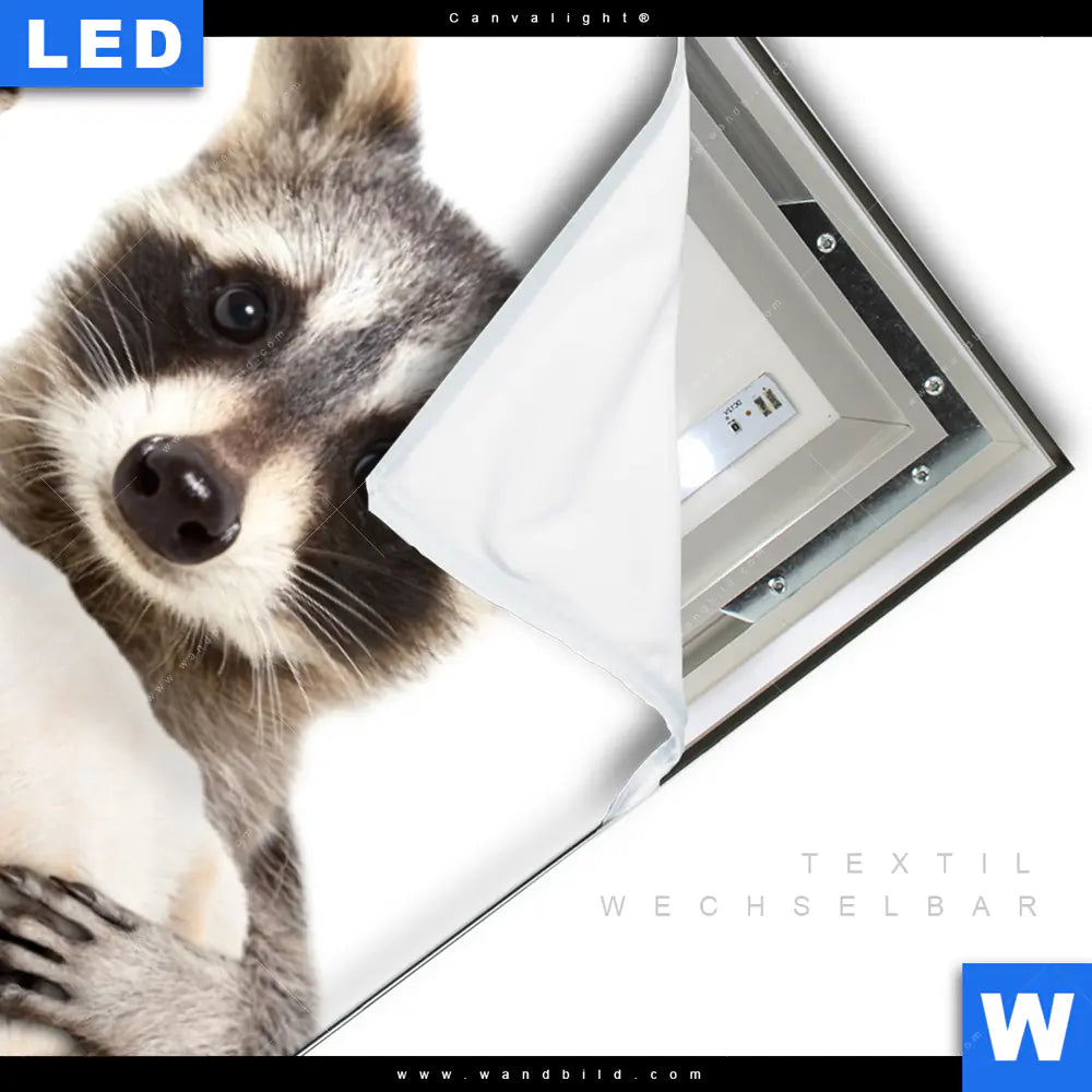 Canvalight® TEX Leuchtbild | Lustige Waschbären mit Hund | Hochformat