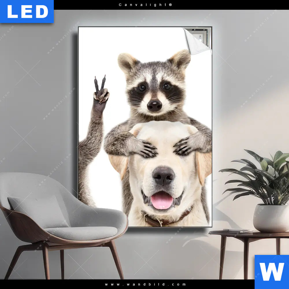 Canvalight® Leuchtbild | Lustige Waschbären mit Hund | Hochformat