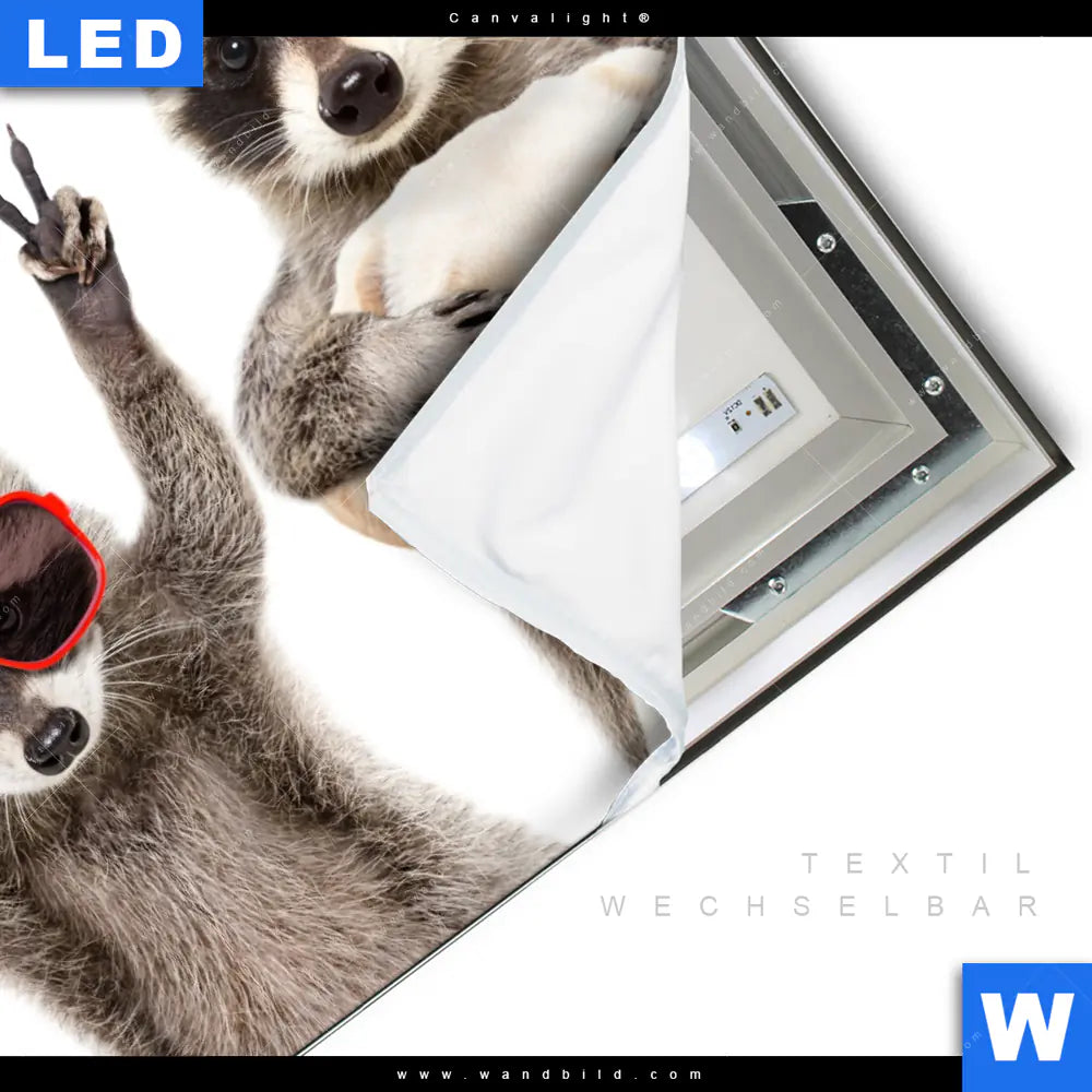 Canvalight® TEX Leuchtbild | Lustige Waschbären mit Hund | Quadrat