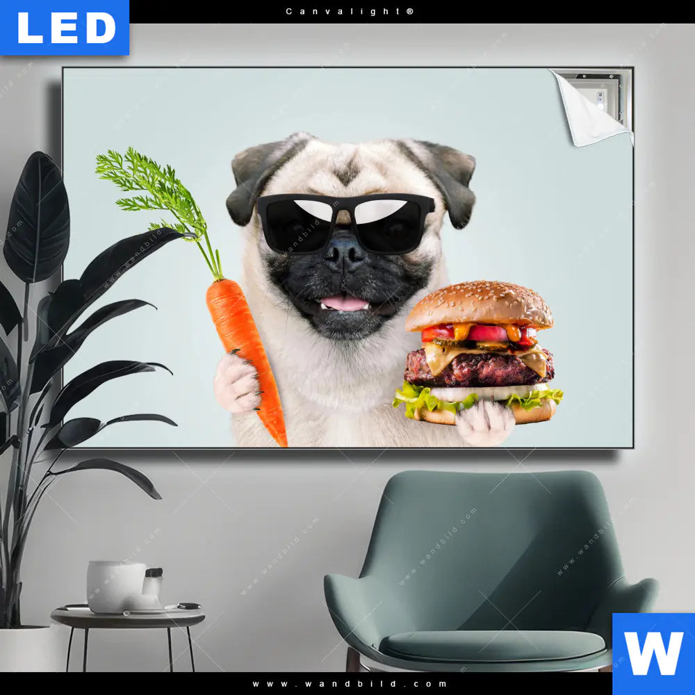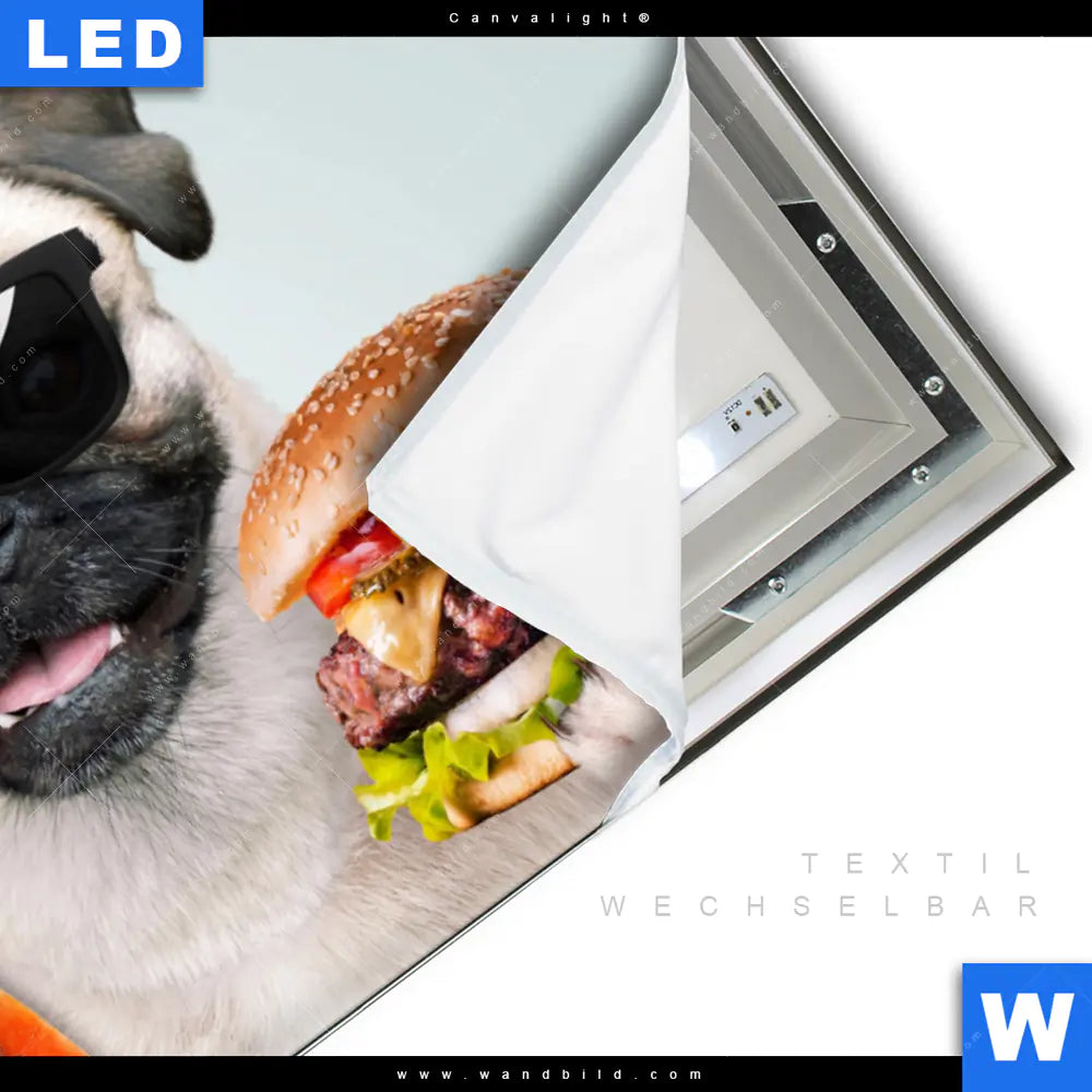 Canvalight® TEX Leuchtbild | Lustiger Hund mit Burger | Querformat