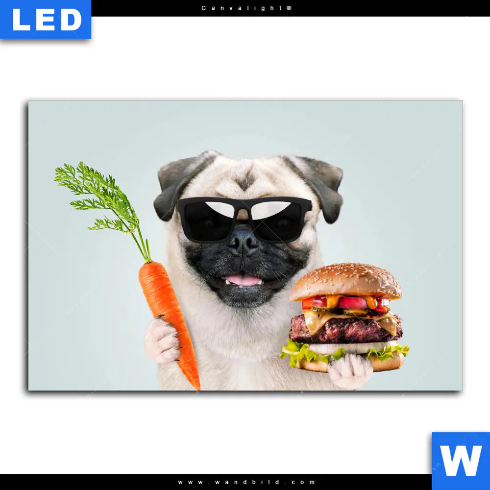 Canvalight® Leuchtbild | Lustiger Hund mit Burger | Querformat