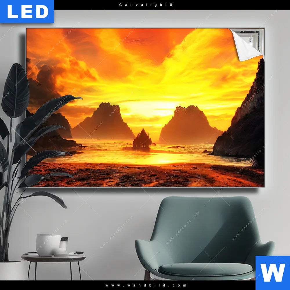 Canvalight® TEX Leuchtbild | Magische Steinlandschaft im Meer | Querformat