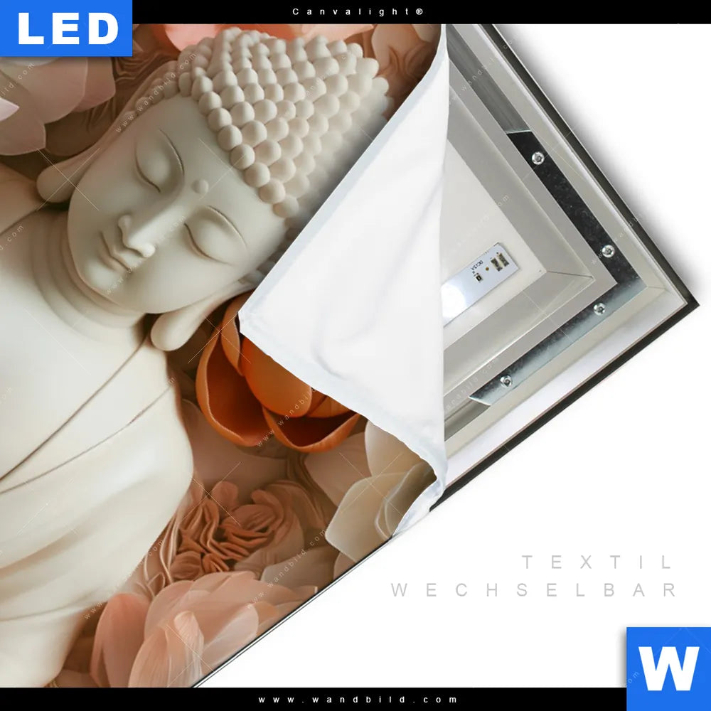 LED-Textilrahmen-Bild mit austauschbarem Buddha - Feng Shui, Blumen - Botanik Textil-Druck (Wechselbild)