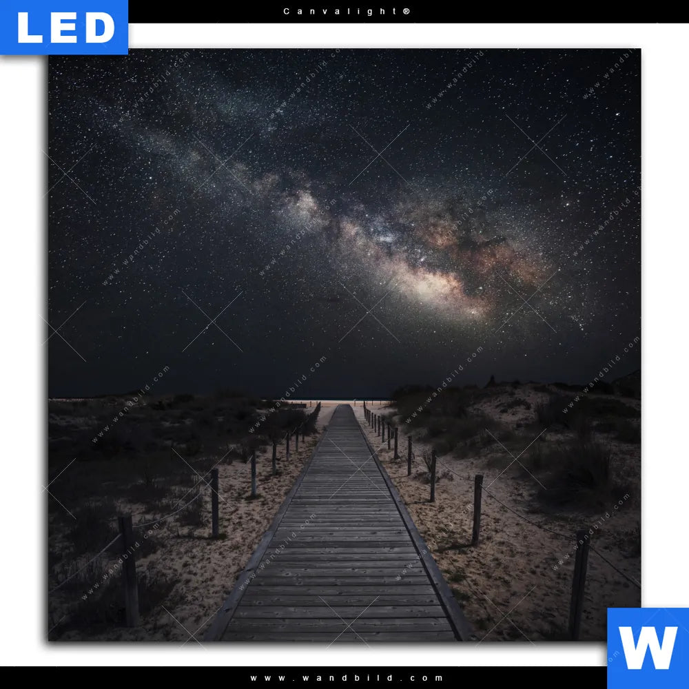 Canvalight® Leuchtbild | Milchstraße über einem Holzweg | Quadrat