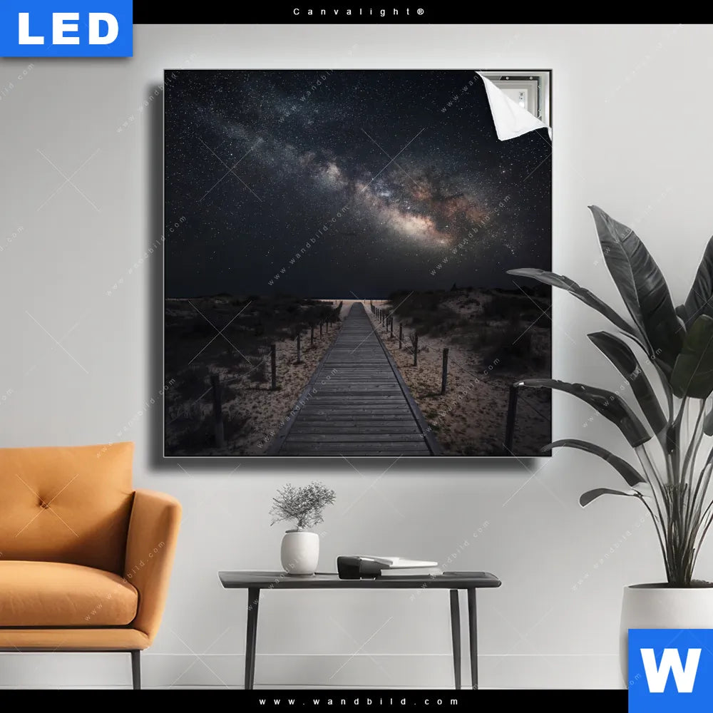 Canvalight® TEX Leuchtbild | Milchstraße über einem Holzweg | Quadrat