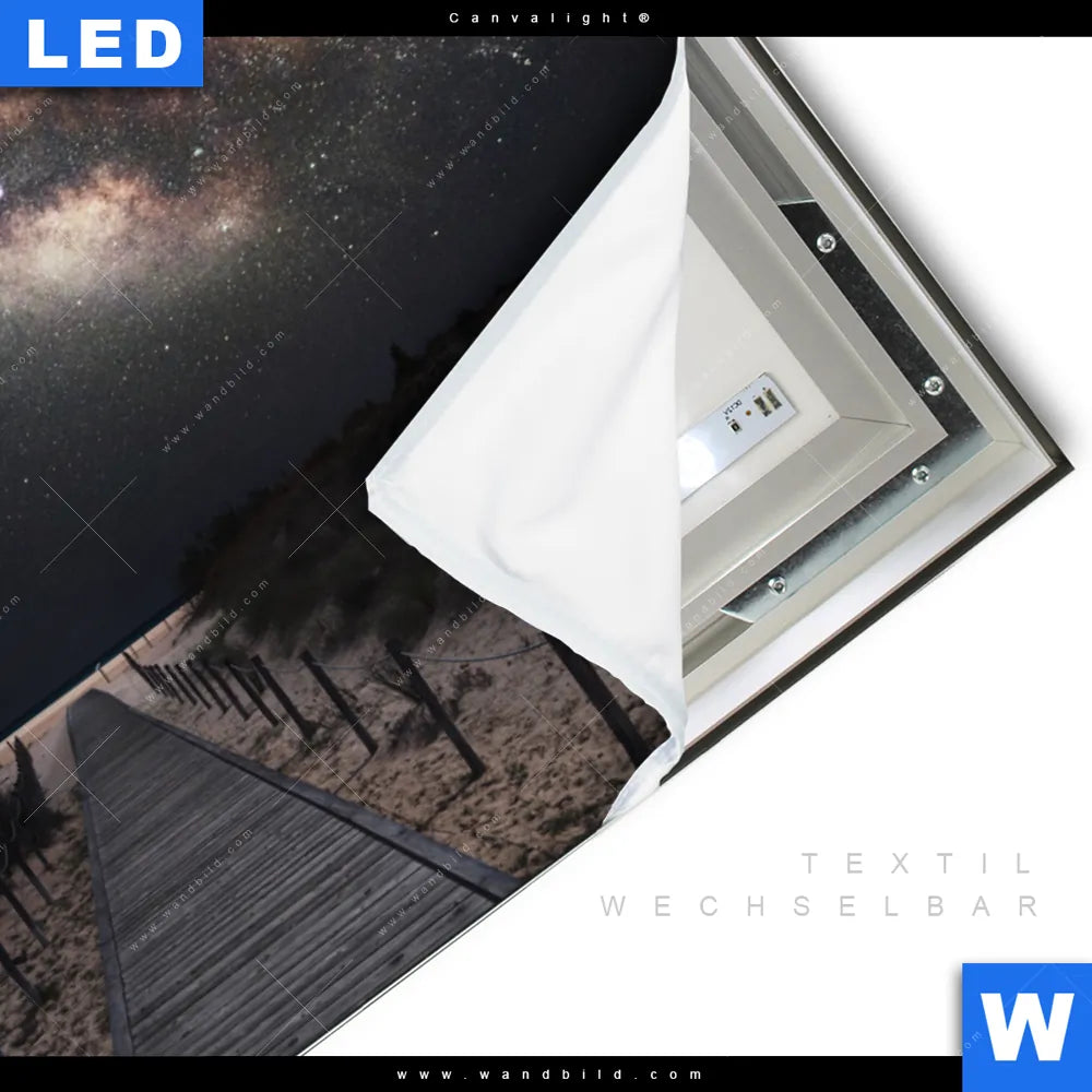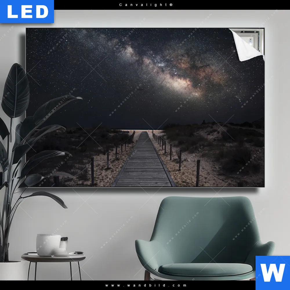 Canvalight® TEX Leuchtbild | Milchstraße über einem Holzweg | Querformat