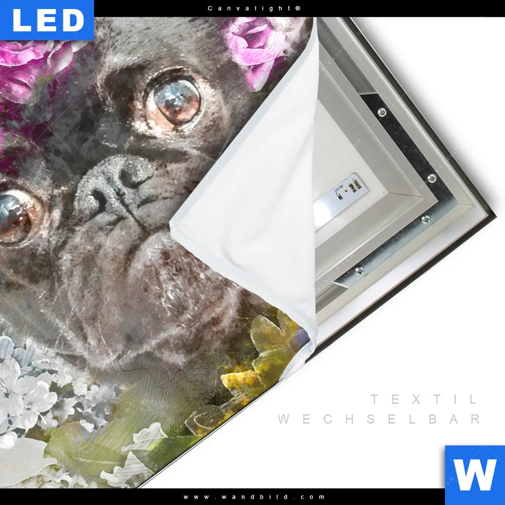 Canvalight® TEX Leuchtbild | Mops & Blumen | Quadrat