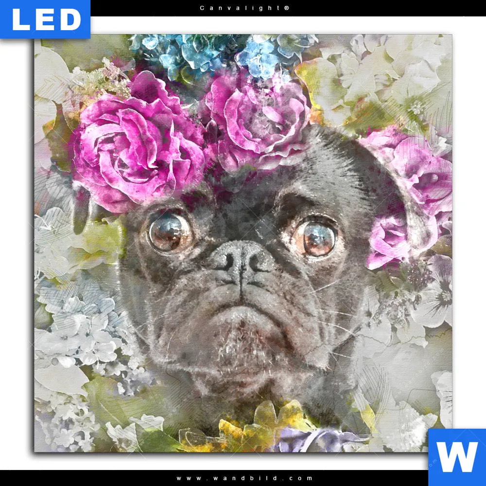 Canvalight® Leuchtbild | Mops & Blumen | Quadrat