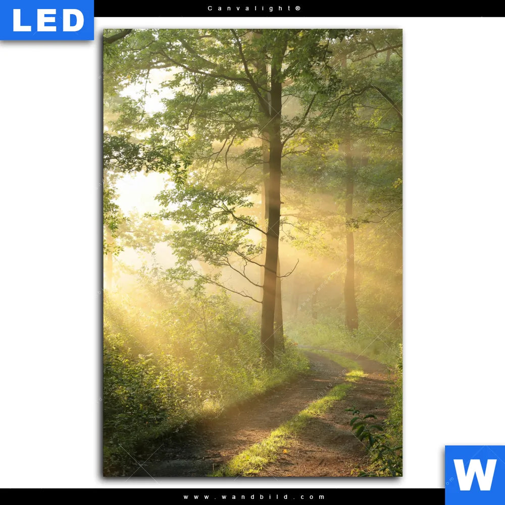 Canvalight® Leuchtbild | Morgenspaziergang im nebeligem Wald | Hochformat