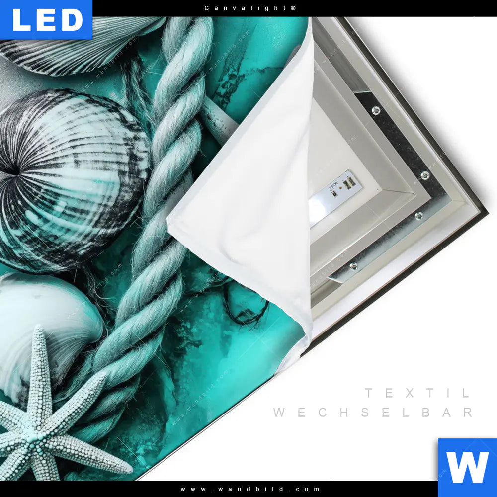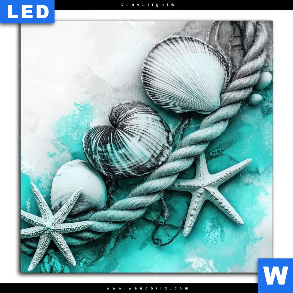 Canvalight® TEX Leuchtbild | Muscheln-Meereszauber in Türkis | Quadrat