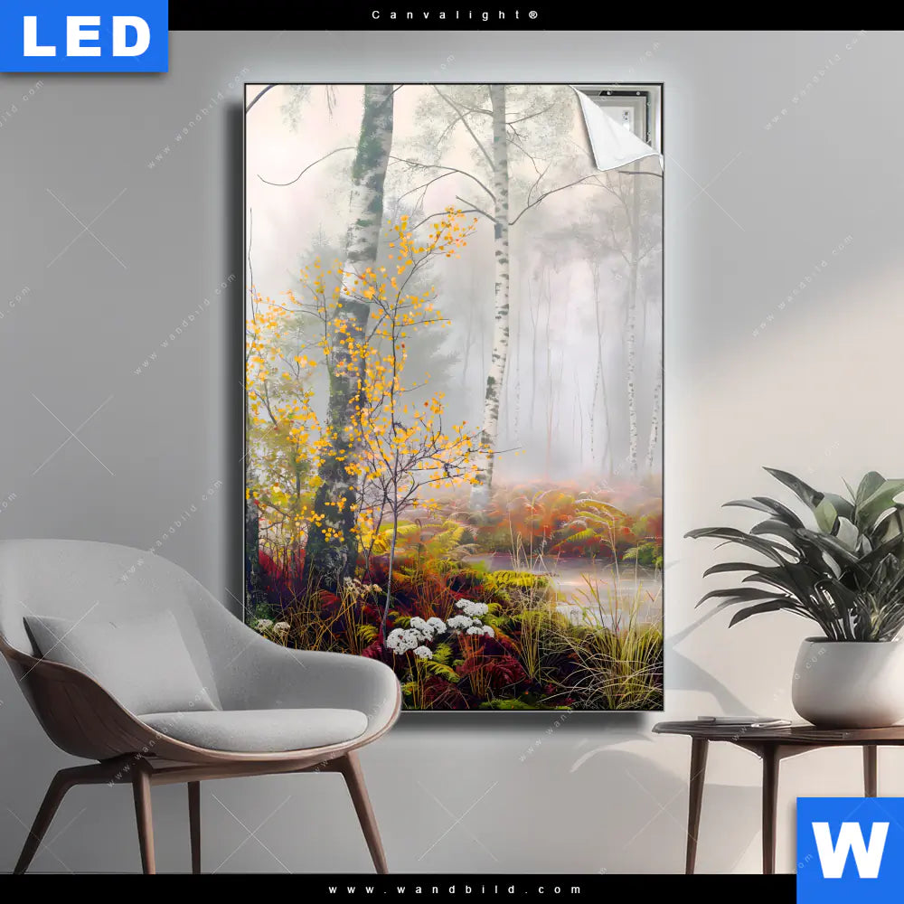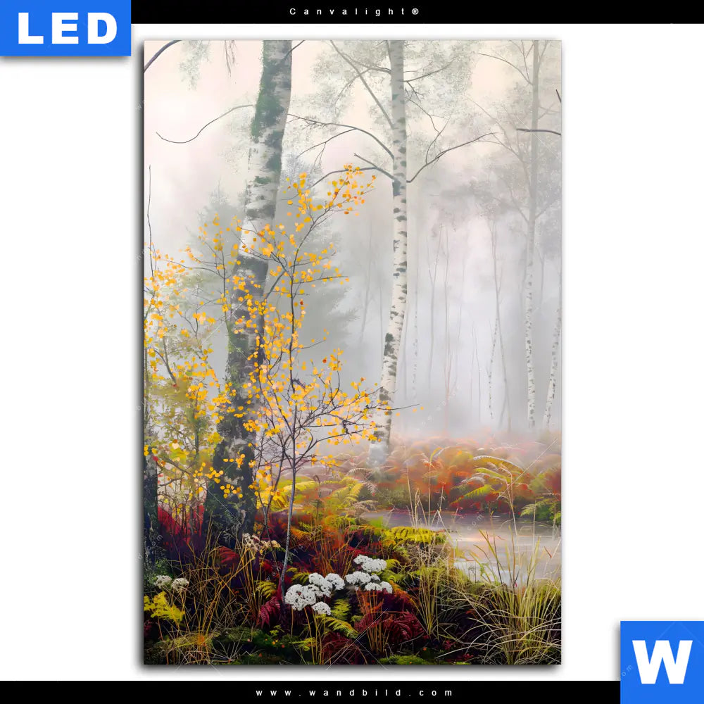 Canvalight® Leuchtbild | Naturidylle - Birken im Nebel | Hochformat