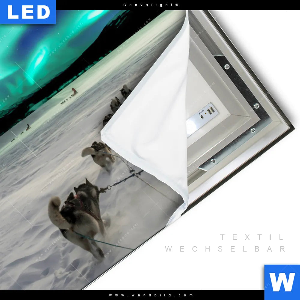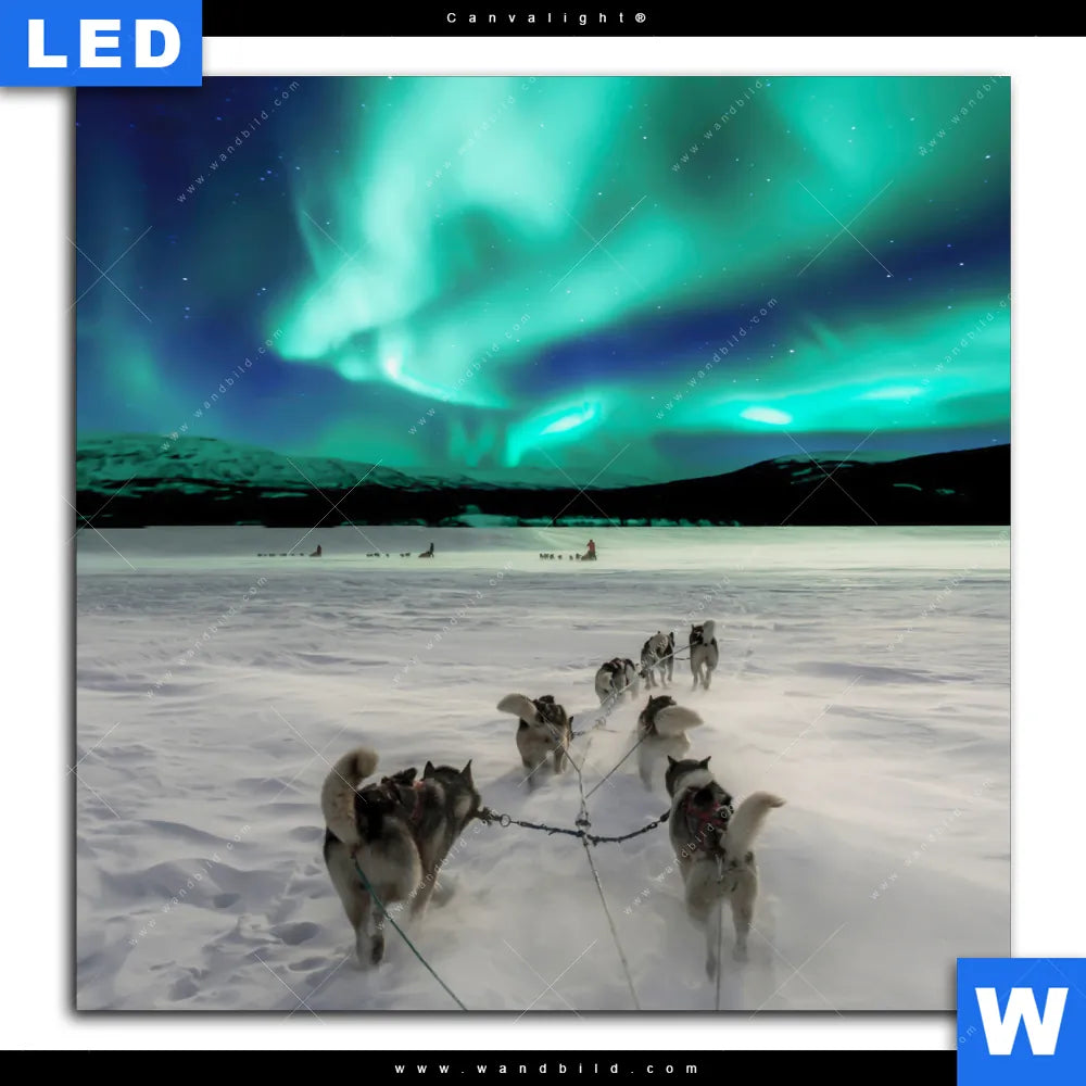 Canvalight® TEX Leuchtbild | Nordlichter und Schlittenhunde | Quadrat