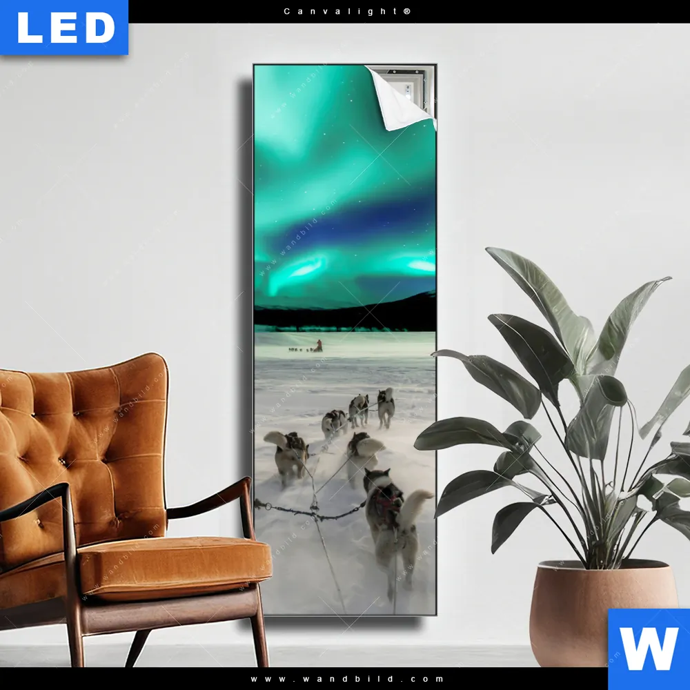Canvalight® TEX Leuchtbild | Nordlichter und Schlittenhunde | Schmal