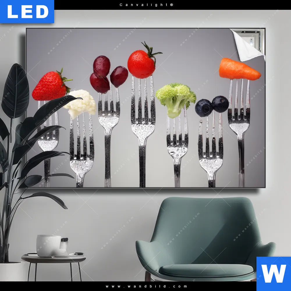 Canvalight® Leuchtbild | Obst & Gemüse auf Gabeln | Querformat