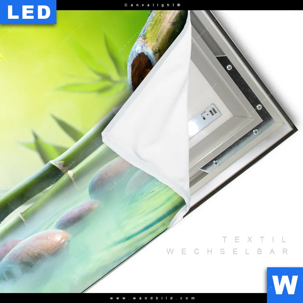 LED-Textilrahmen-Bild mit austauschbarem Buddha - Feng Shui, Blumen - Botanik Textil-Druck (Wechselbild)