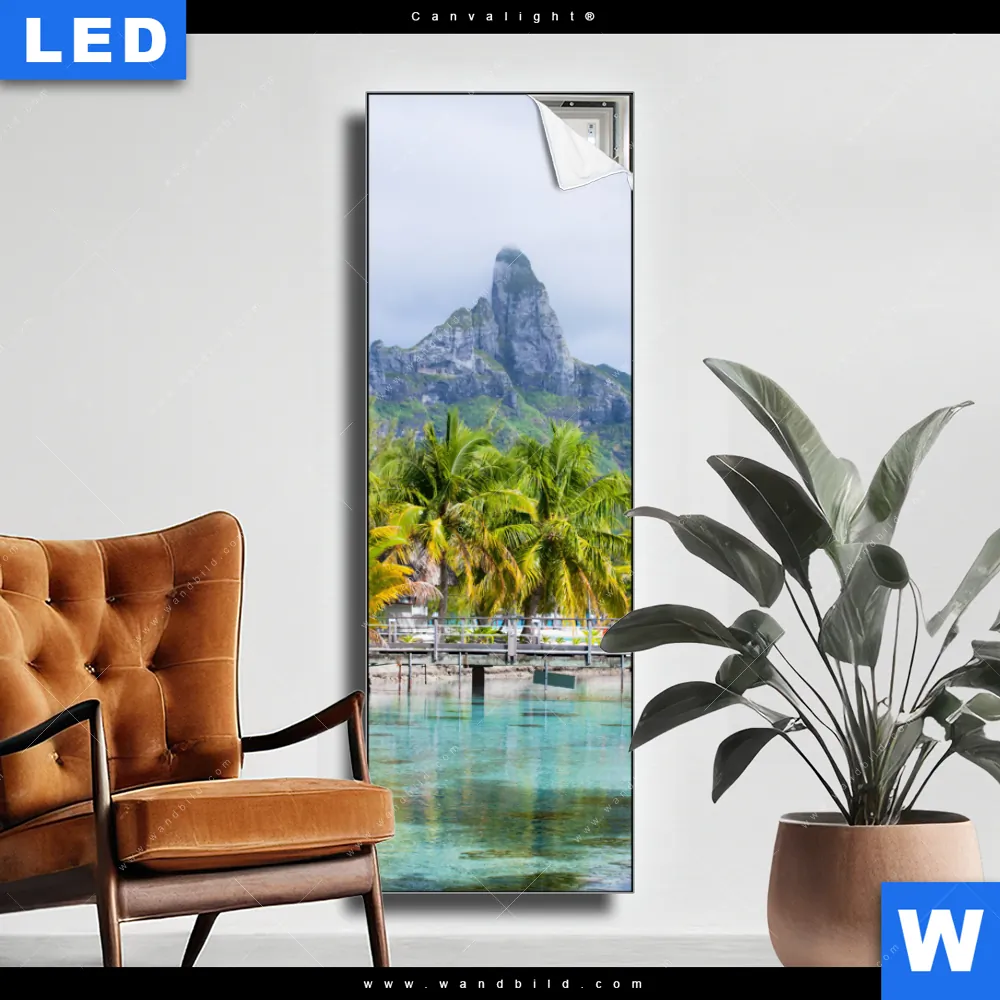 Canvalight® Leuchtbild | Palmen & Berg auf Insel | Schmal