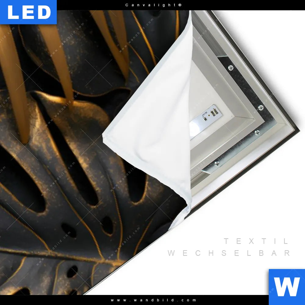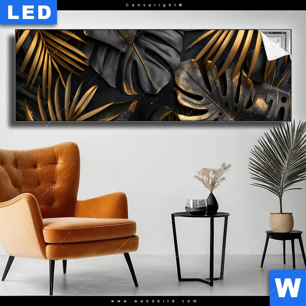 Canvalight® TEX Leuchtbild | Palmenblätter Schwarz Gold | Panorama