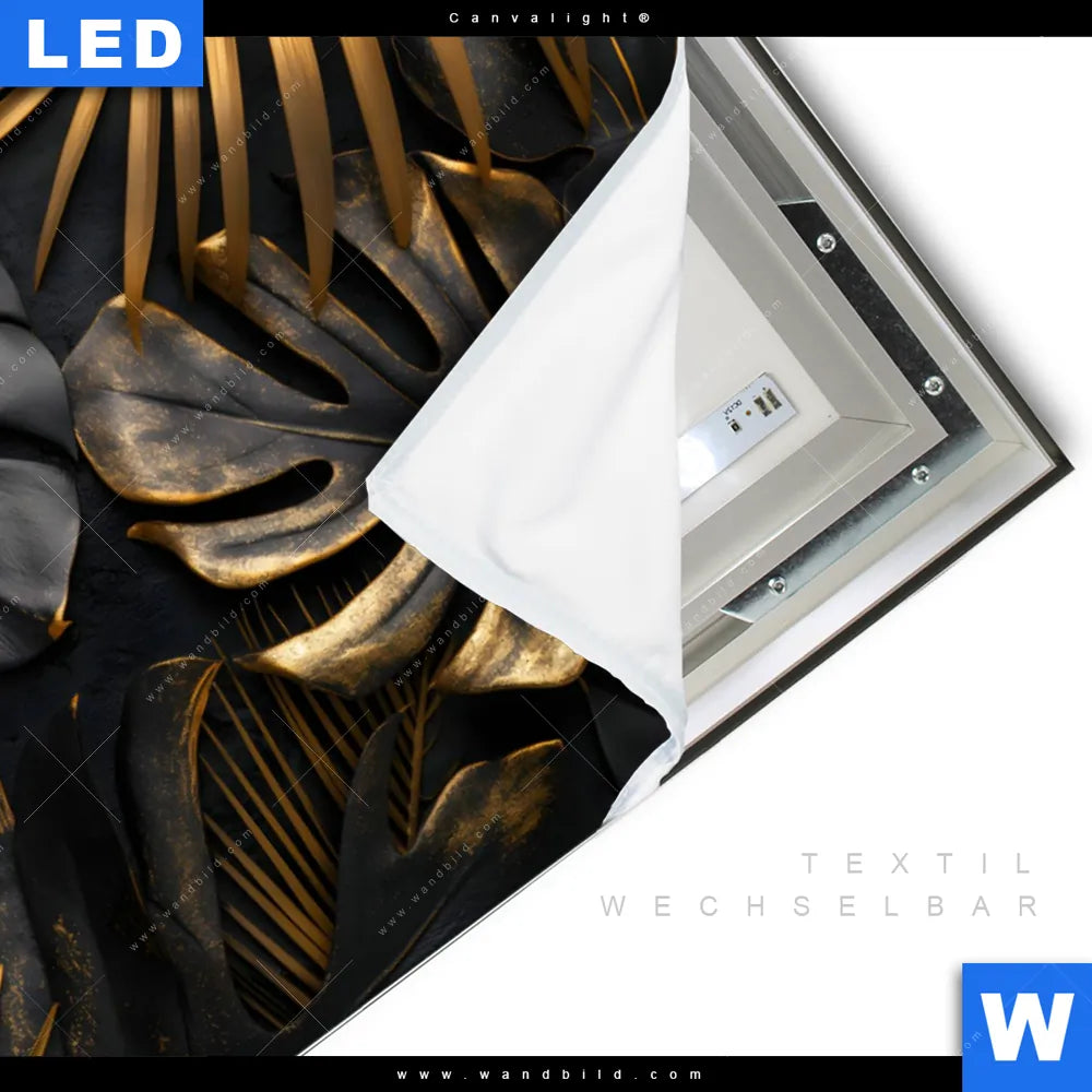 Canvalight® TEX Leuchtbild | Palmenblätter Schwarz Gold | Querformat