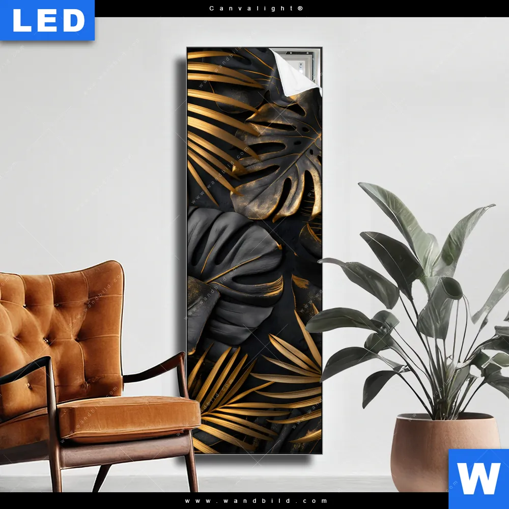 Canvalight® TEX Leuchtbild | Palmenblätter Schwarz Gold | Schmal