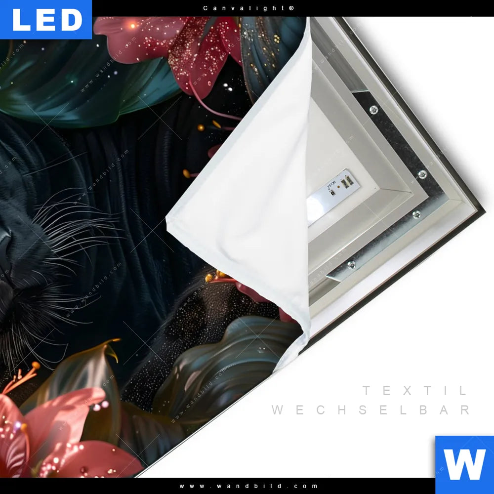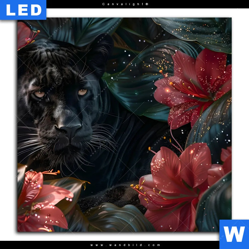 Canvalight® TEX Leuchtbild | Panther und rote Blüten | Quadrat