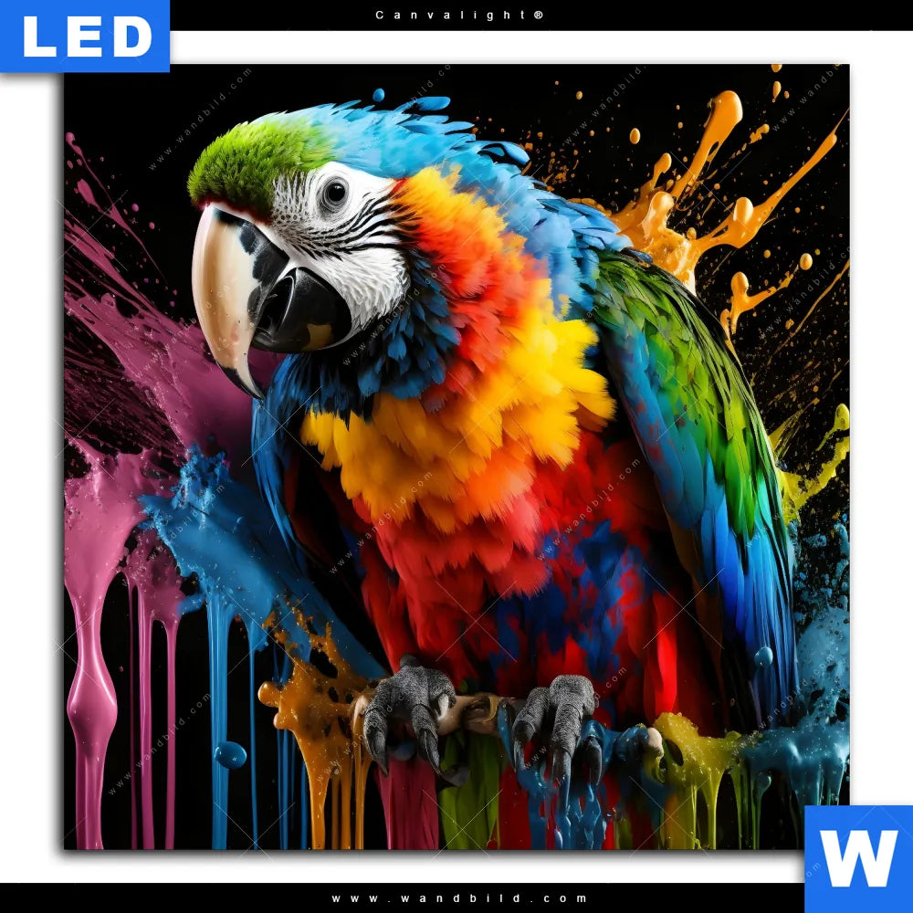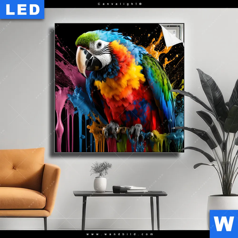 Canvalight® Leuchtbild | Papagei mit bunten Farbspritzern | Quadrat