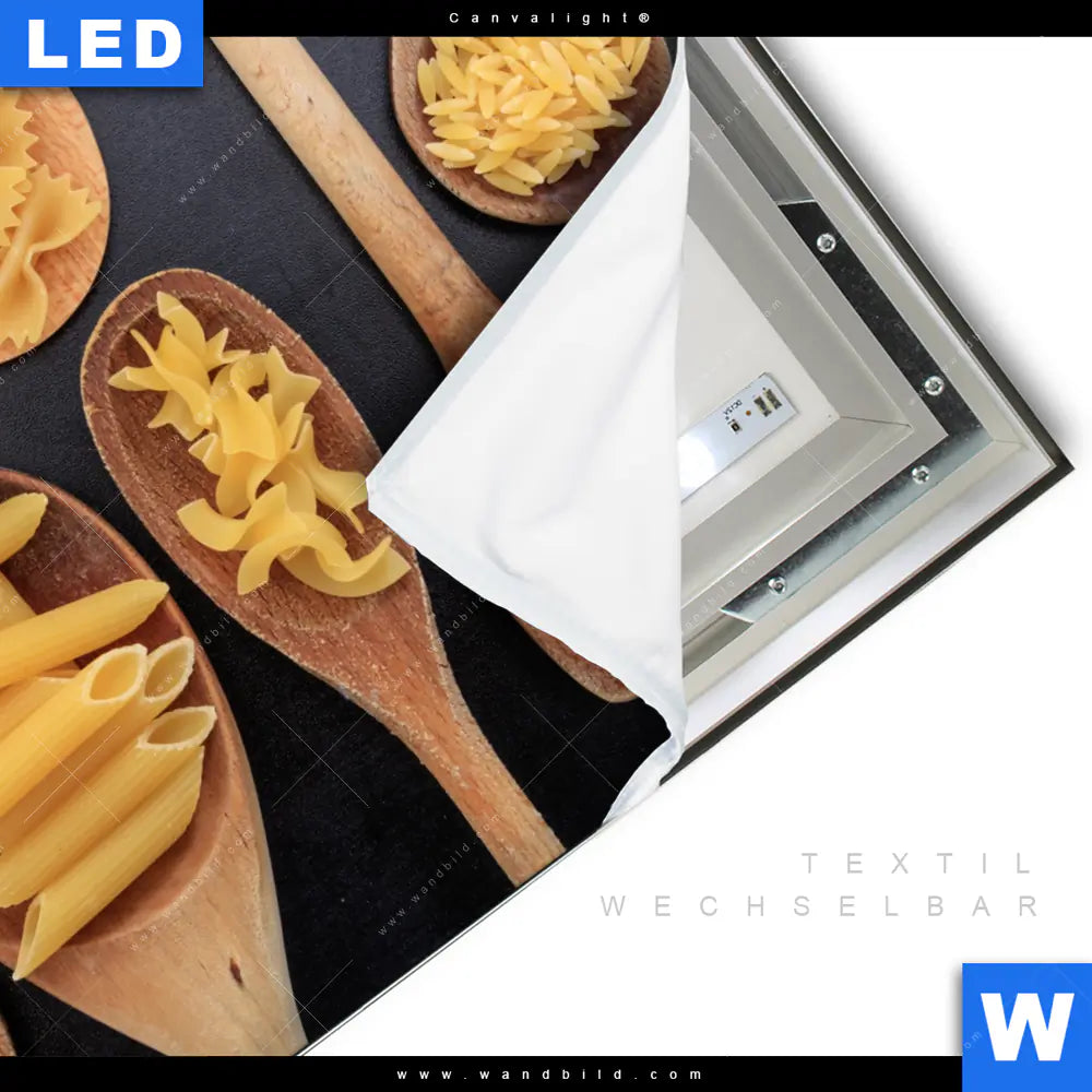 Canvalight® TEX Leuchtbild | Pasta auf Löffeln | Quadrat