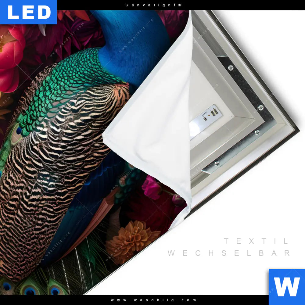Canvalight® TEX Leuchtbild | Prachtvoller Pfau und Blüten | Quadrat