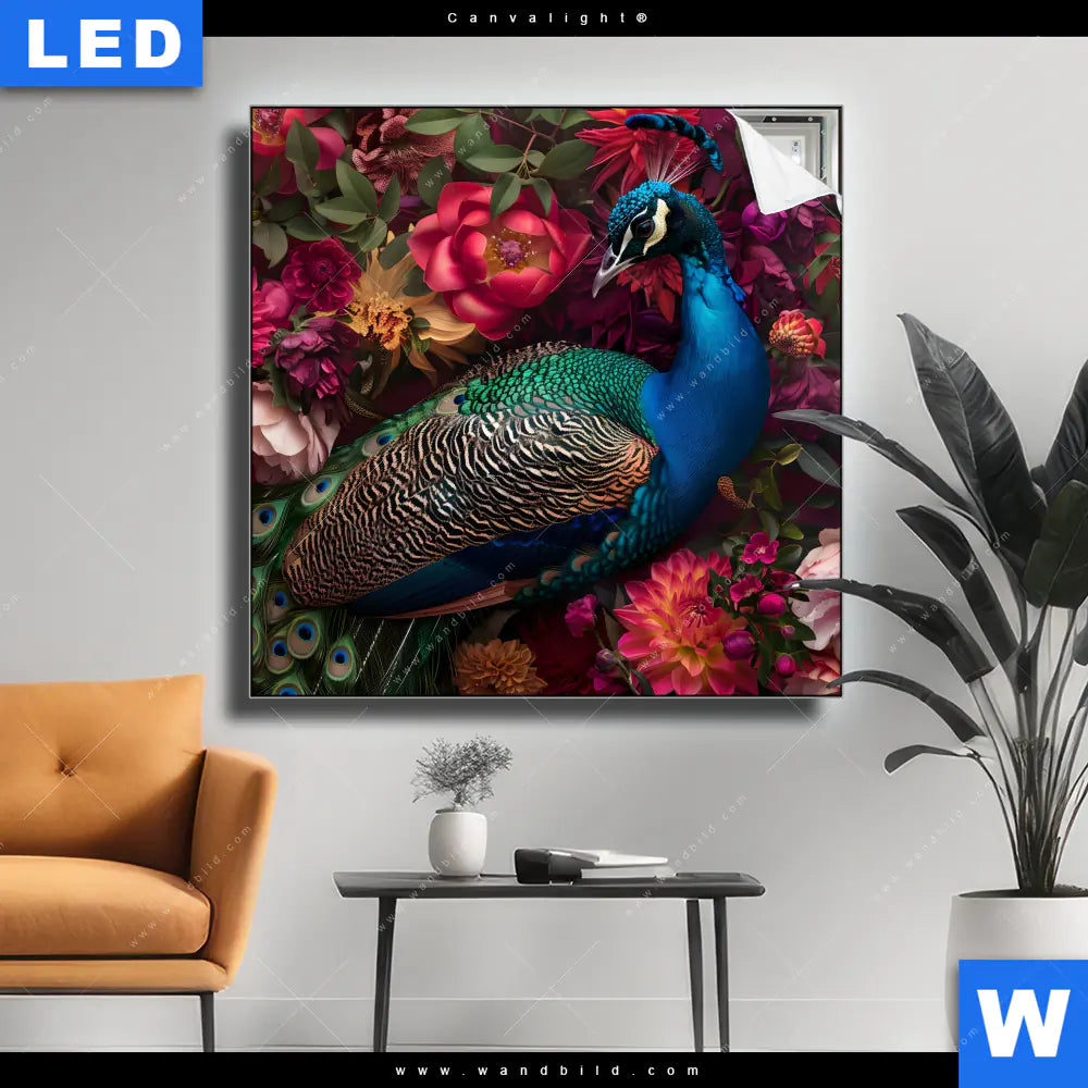 Canvalight® Leuchtbild | Prachtvoller Pfau und Blüten | Quadrat