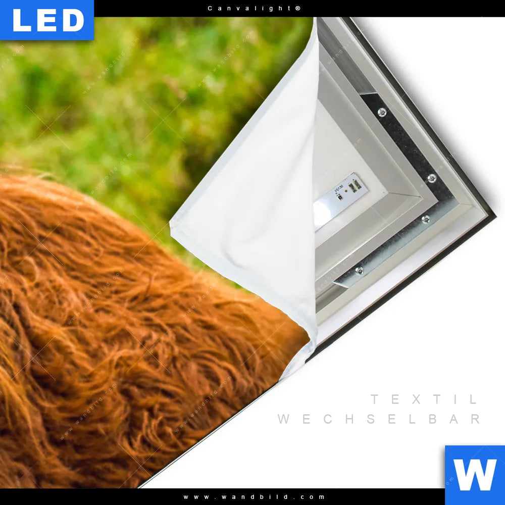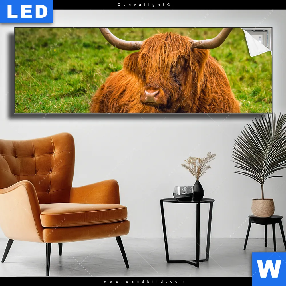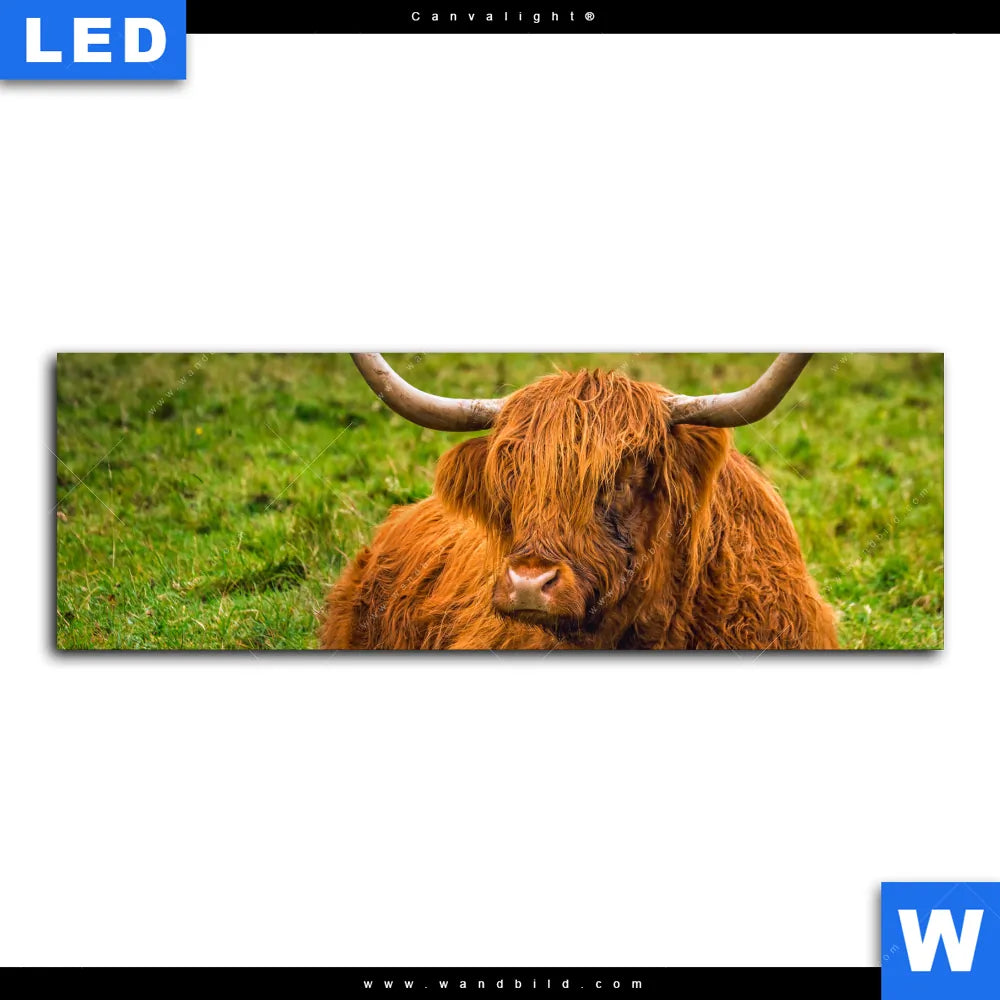 Canvalight® TEX Leuchtbild | Rind in den schottischen Highlands | Panorama