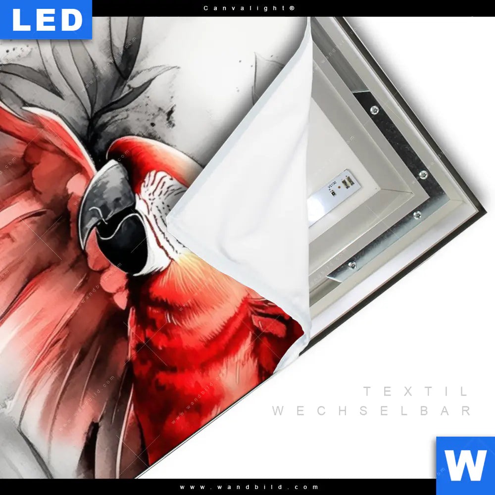 Canvalight® TEX Leuchtbild | Roter Papagei im Flug | Hochformat