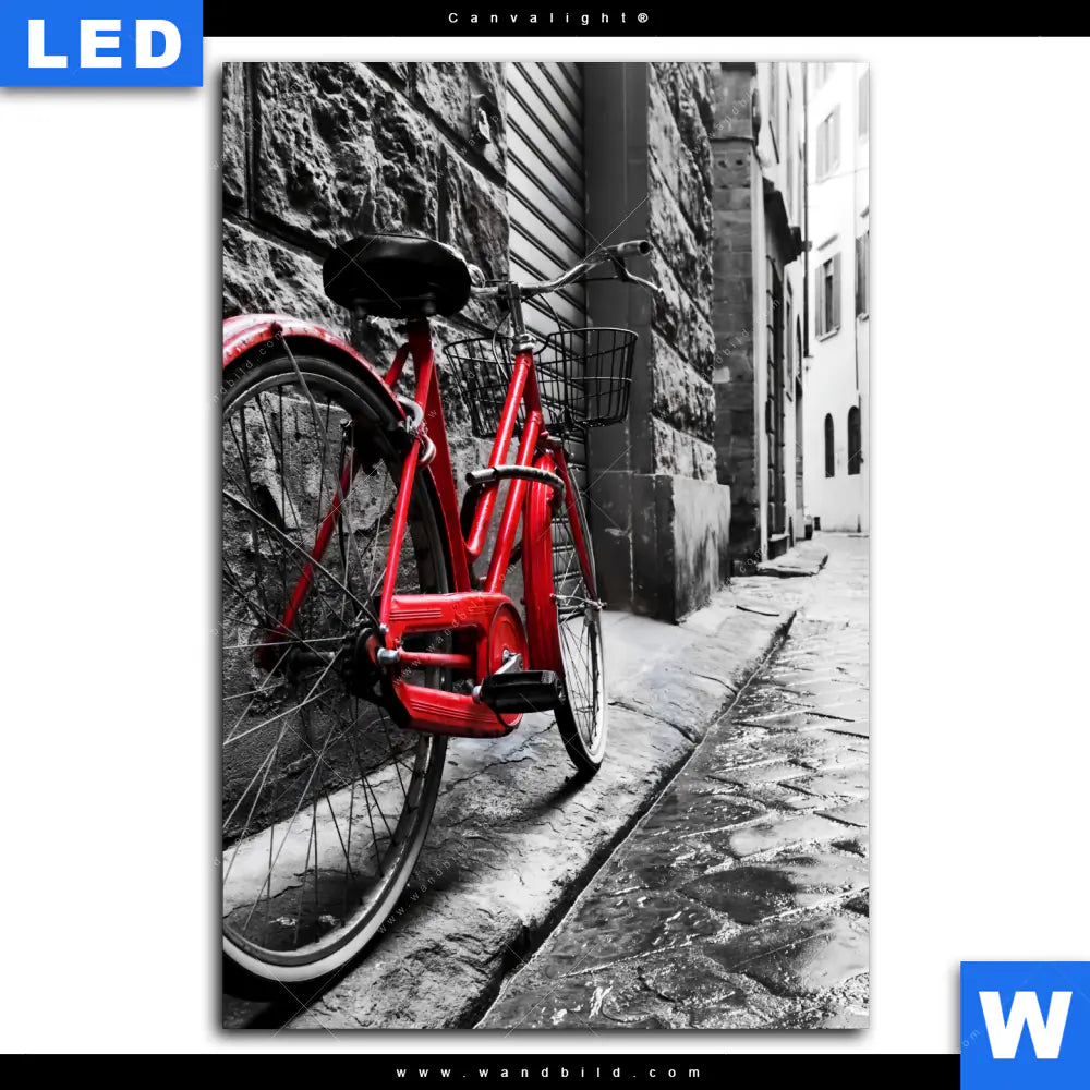 Canvalight® TEX Leuchtbild | Rotes Fahrrad in Gasse | Hochformat