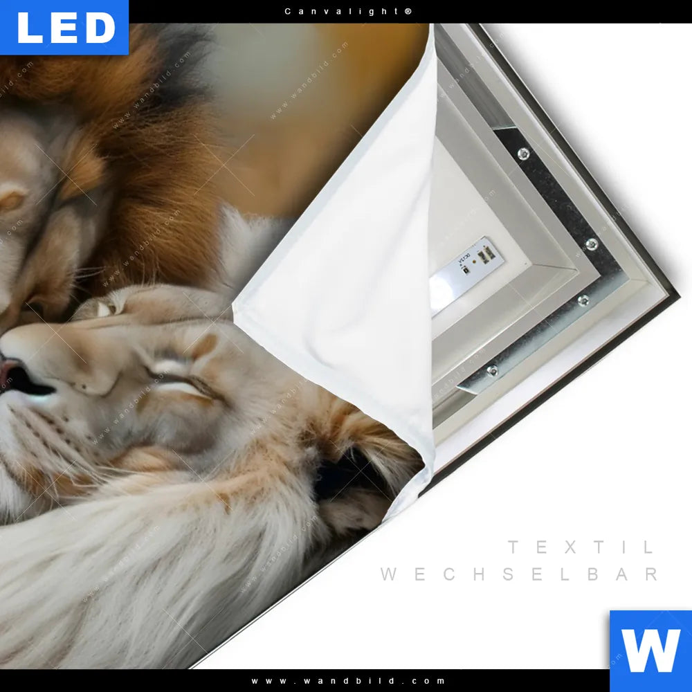 Canvalight® TEX Leuchtbild | Sanfte Löwenmomente in buntem Nebel | Hochformat