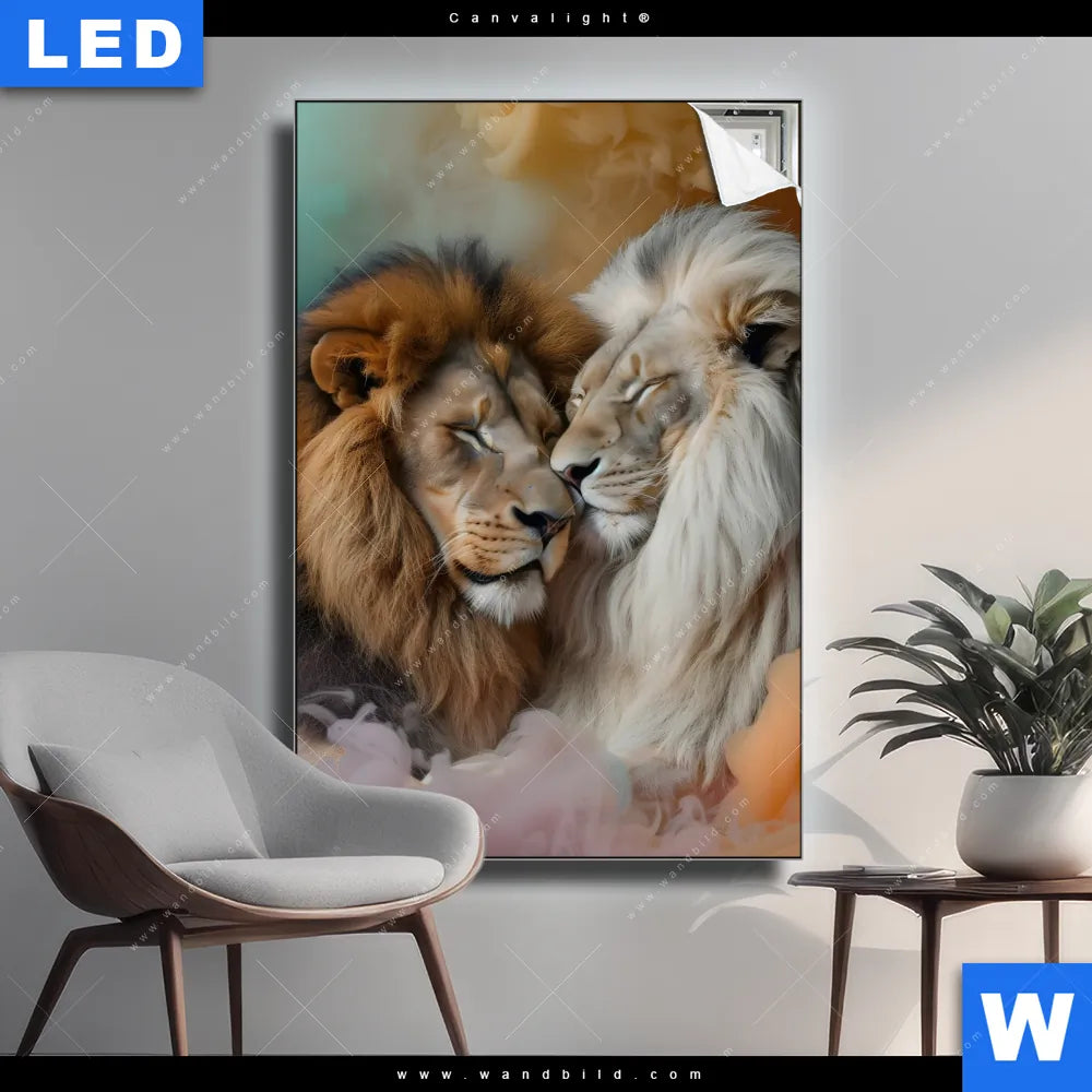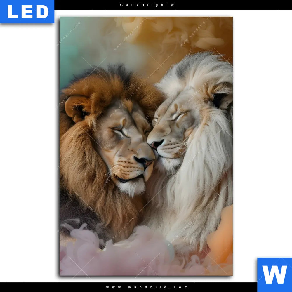 Canvalight® Leuchtbild | Sanfte Löwenmomente in buntem Nebel | Hochformat