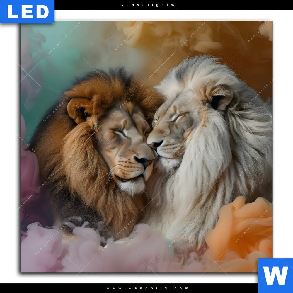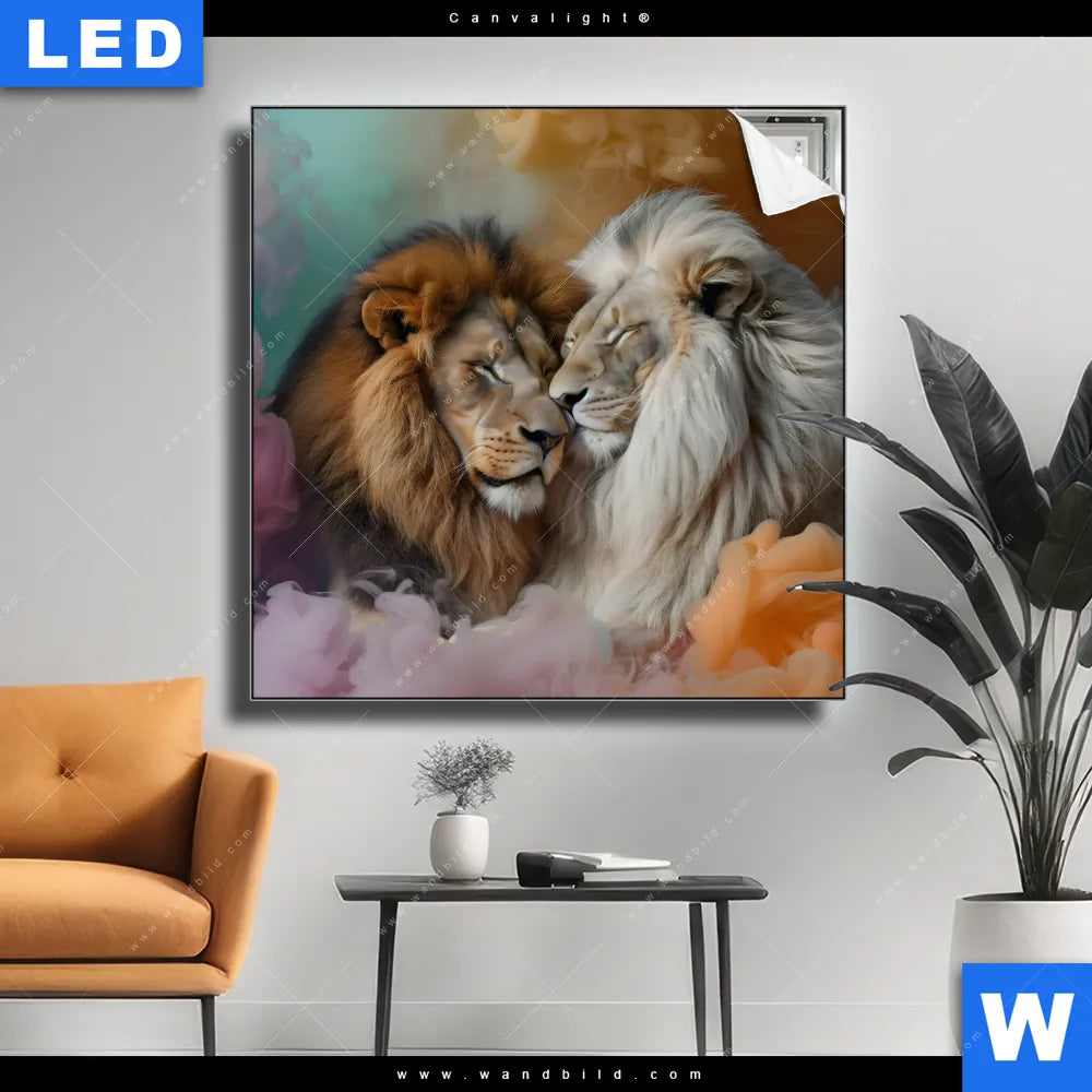 Canvalight® TEX Leuchtbild | Sanfte Löwenmomente in buntem Nebel | Quadrat