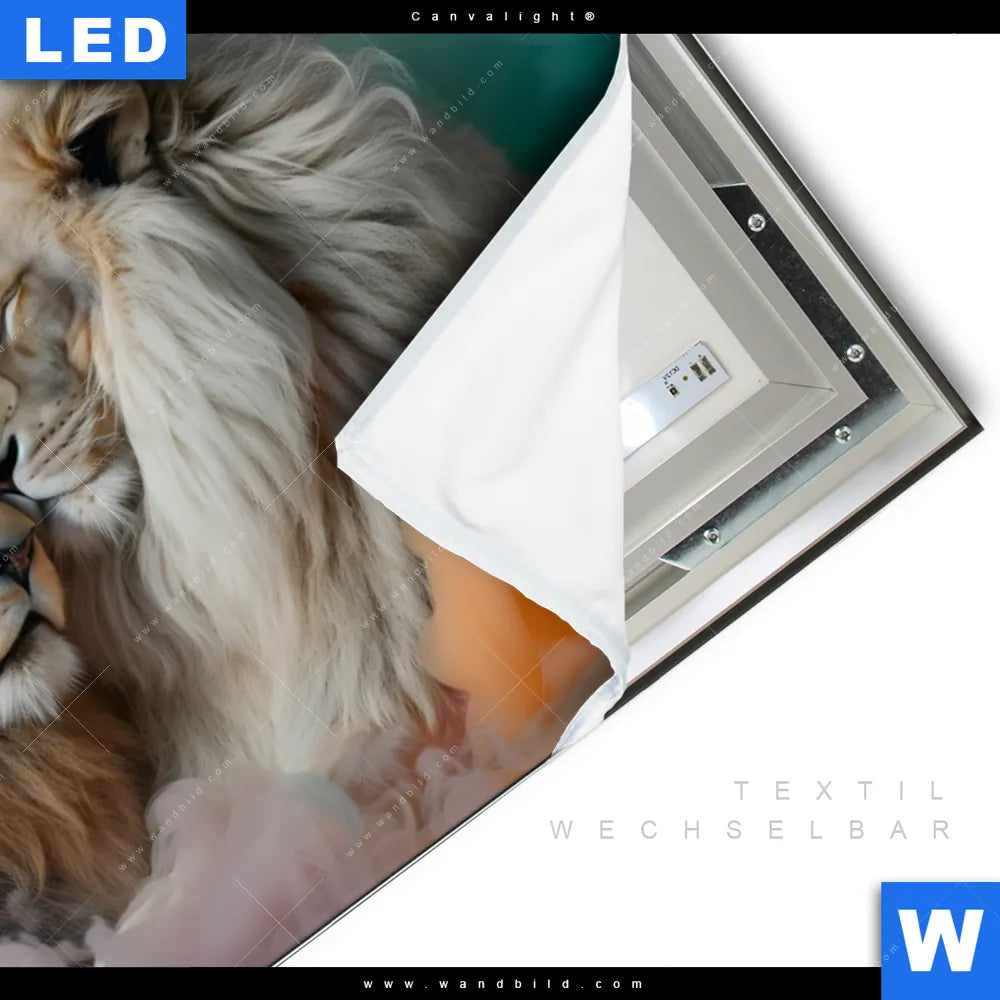 Canvalight® TEX Leuchtbild | Sanfte Löwenmomente in buntem Nebel | Querformat