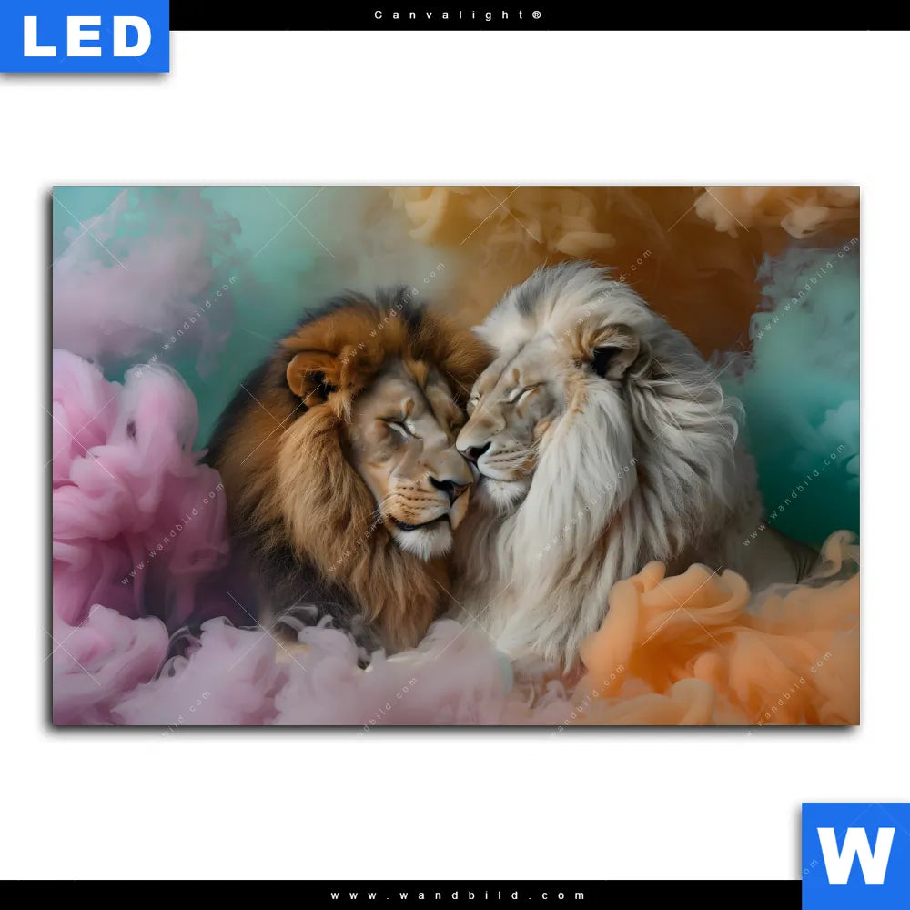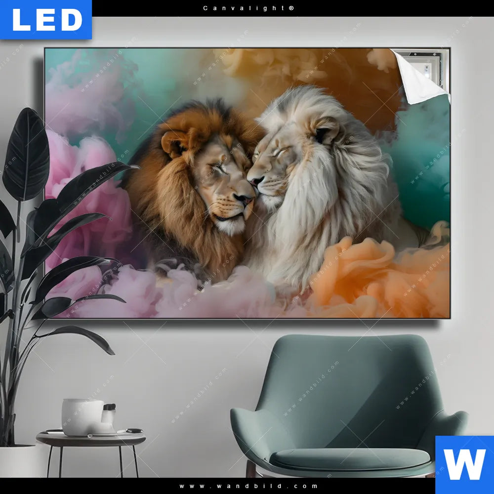Canvalight® Leuchtbild | Sanfte Löwenmomente in buntem Nebel | Querformat