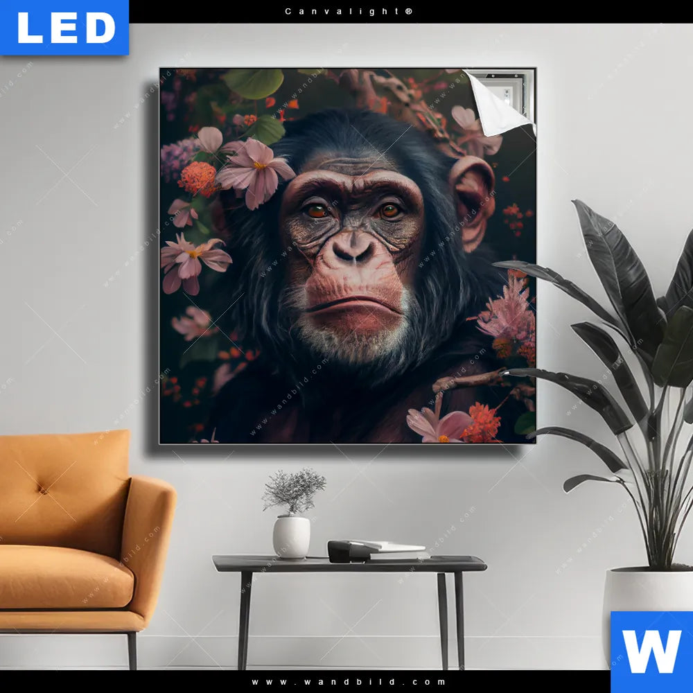 Canvalight® Leuchtbild | Schimpanse zwischen Blumen | Quadrat