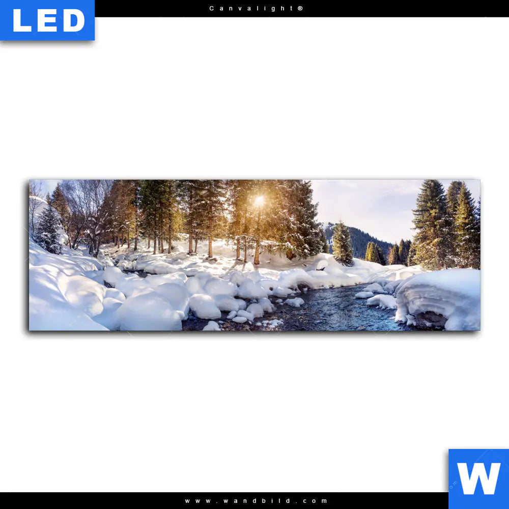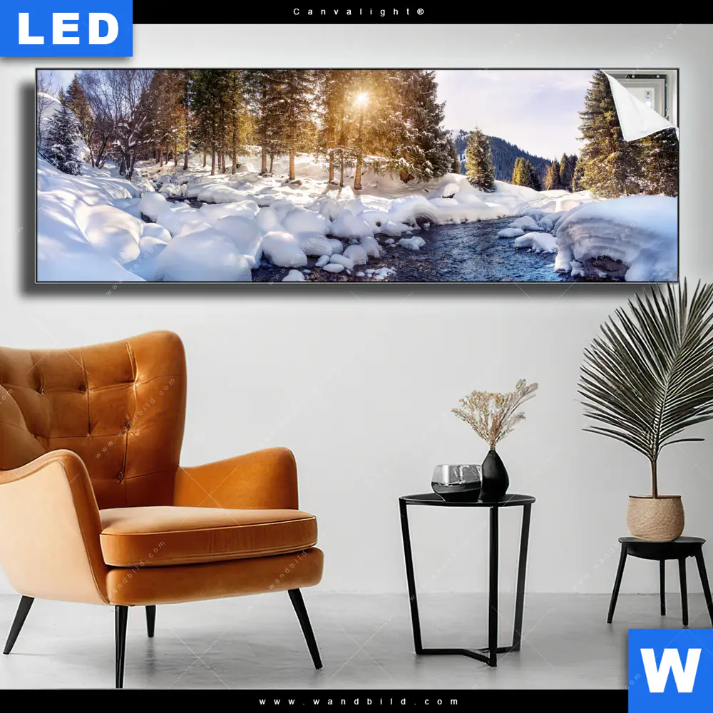 Canvalight® TEX Leuchtbild | Schneebedeckte Landschaft am Fluss | Panorama