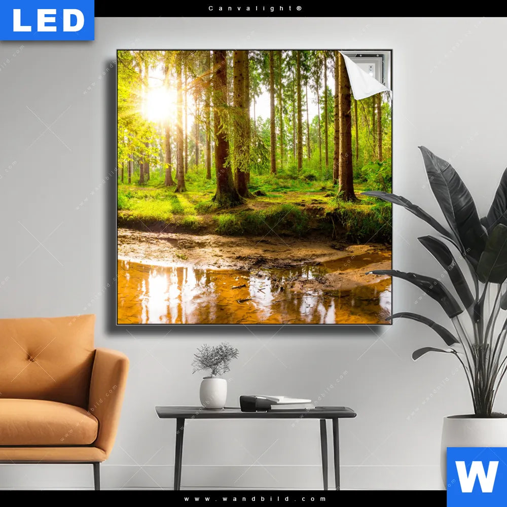 Canvalight® TEX Leuchtbild | Sonne im grünen Wald | Quadrat