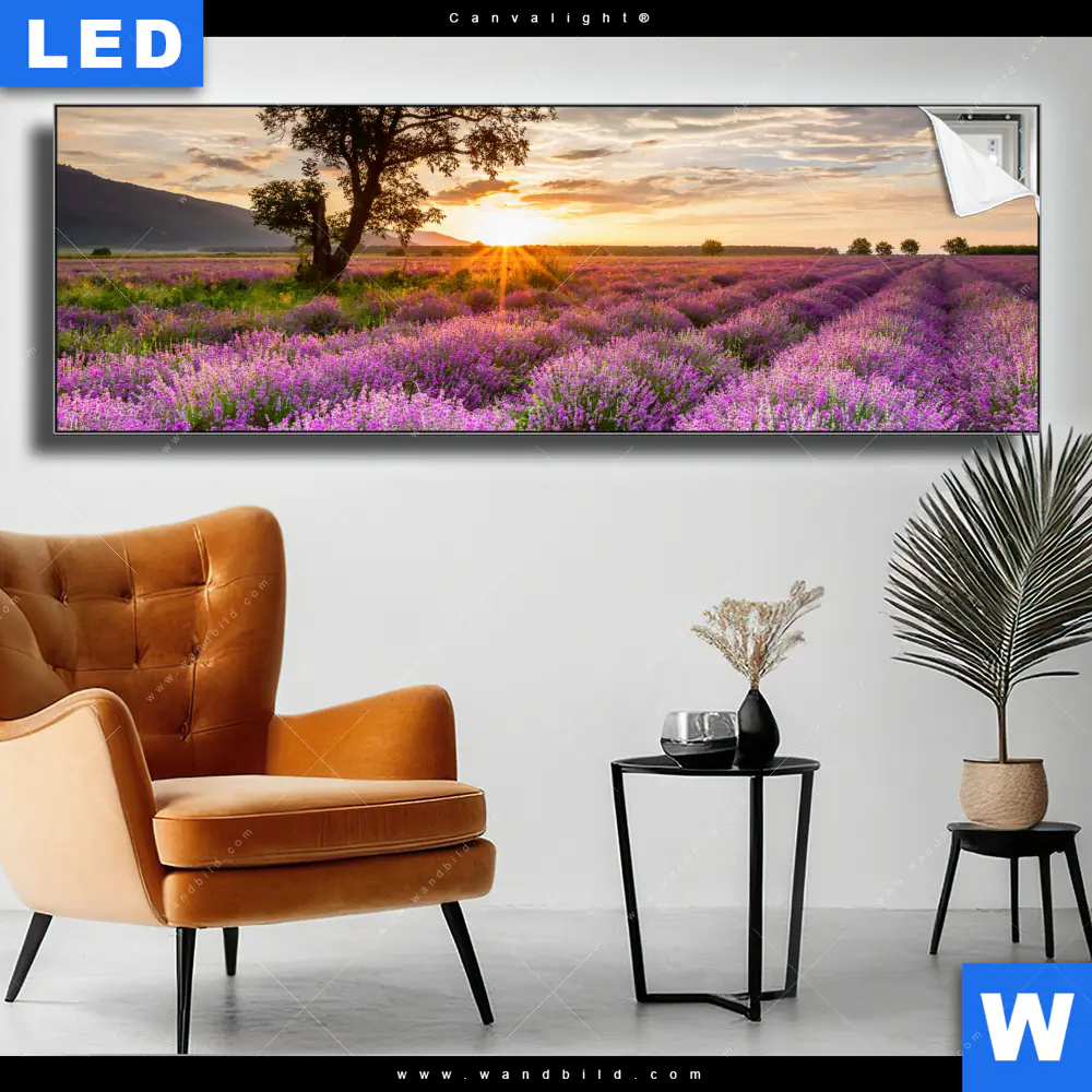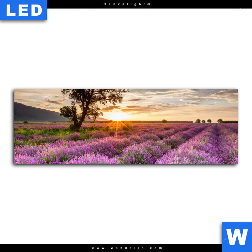 Canvalight® TEX Leuchtbild | Sonnenaufgang im Lavendelfeld | Panorama